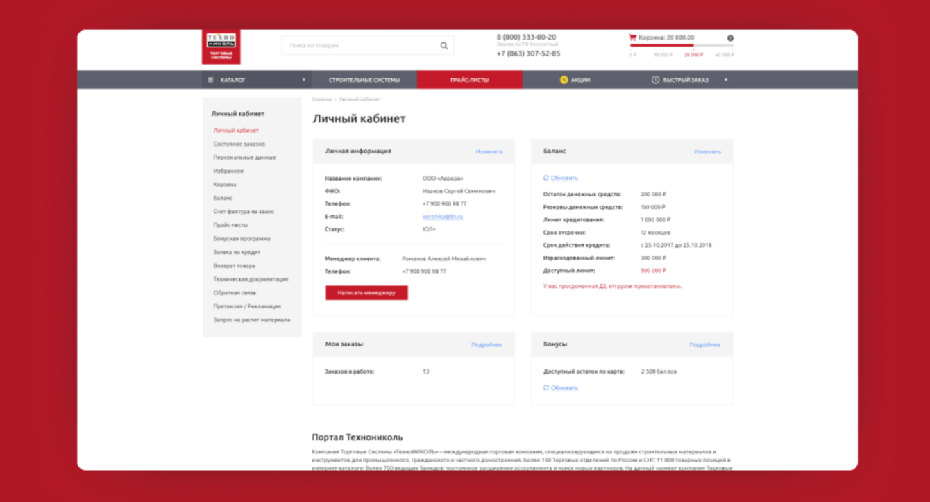2. На главной странице клиент корпоративного портала видит личную информацию и контакты персонального менеджера, актуальный баланс денежных средств и кредитный лимит, количество заказов в работе, бонусный баланс.