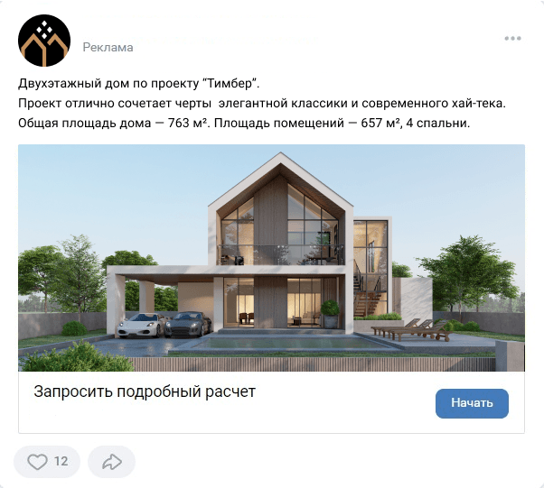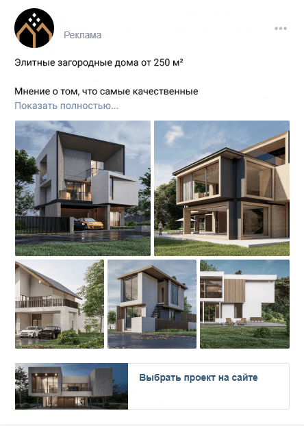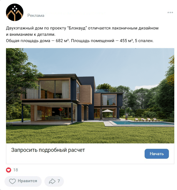Приведя пользователя в сообщество, мы покажем настоящие проекты и экспертность клиента, расскажем про актуальные тренды в загородной недвижимости, а также ответим на возможные вопросы. Таким образом замотивируем человека стать подписчиком группы.