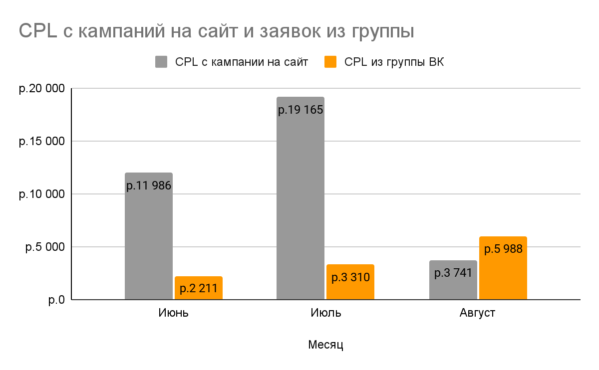 Кампания действовала три месяца. За это время на сайт получили 14 заявок с CPL 10 143 ₽. Из группы ВК пришло 17 заявок с CPL 3 516 ₽ — то есть, привести пользователя через эту социальную сеть оказалось почти в три раза дешевле.