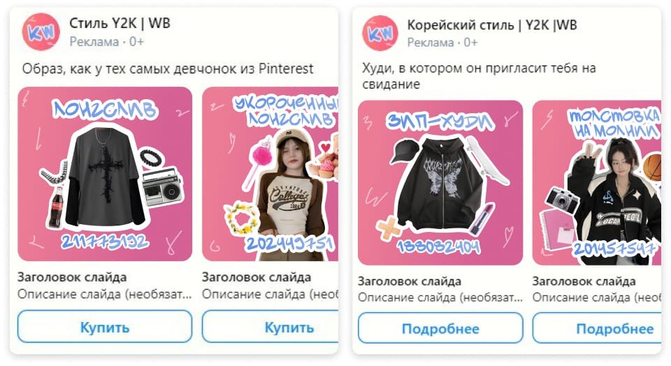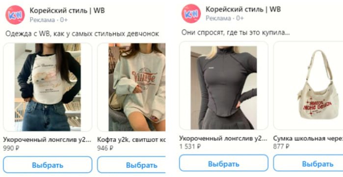 Так как дизайн в такой рекламе использовать нельзя, мы опирались на мощные, броские заголовки: «Они спросят, где ты это купила», «Одежда с WB, как у самых топовых девчонок». Уже в первые дни реклама показала себя просто отлично!