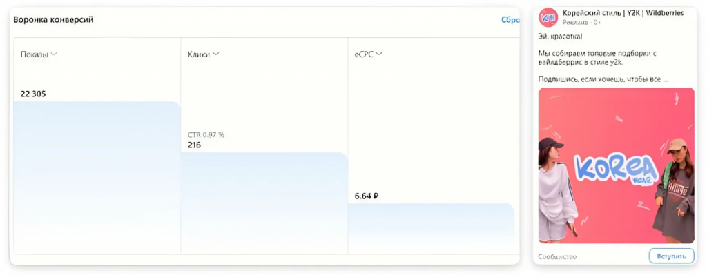 Кампания с привлечением подписок работала немного хуже: средняя стоимость клика на таких объявлениях составляла 13 рублей. Однако при средней стоимости ВК-клика в 15 рублей, можно сделать вывод, что мы вписались в норму.