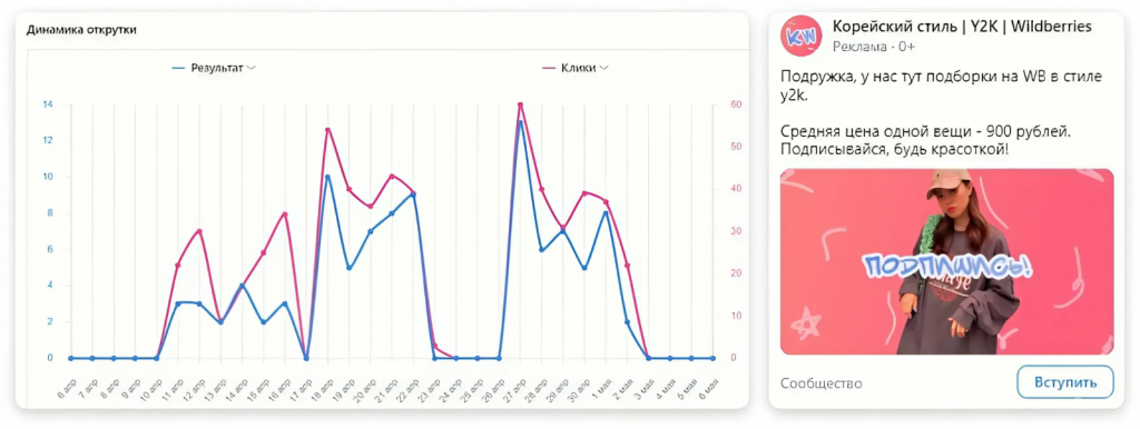 ● протестировали не просто партию вещей, а отдельные подборки (например, худи, «как у девочек из пинтереста»). Кампания зашла на ура: в некоторые дни цена клика составляла 1 рубль, средняя цена – 2 рубля.