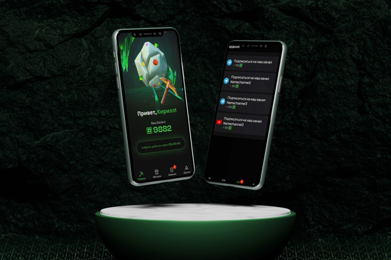 – Основной экран с майнингом. На главном экране нарисован камень с валютой клиента, сундук для добычи как на референсе в Figma клиента.