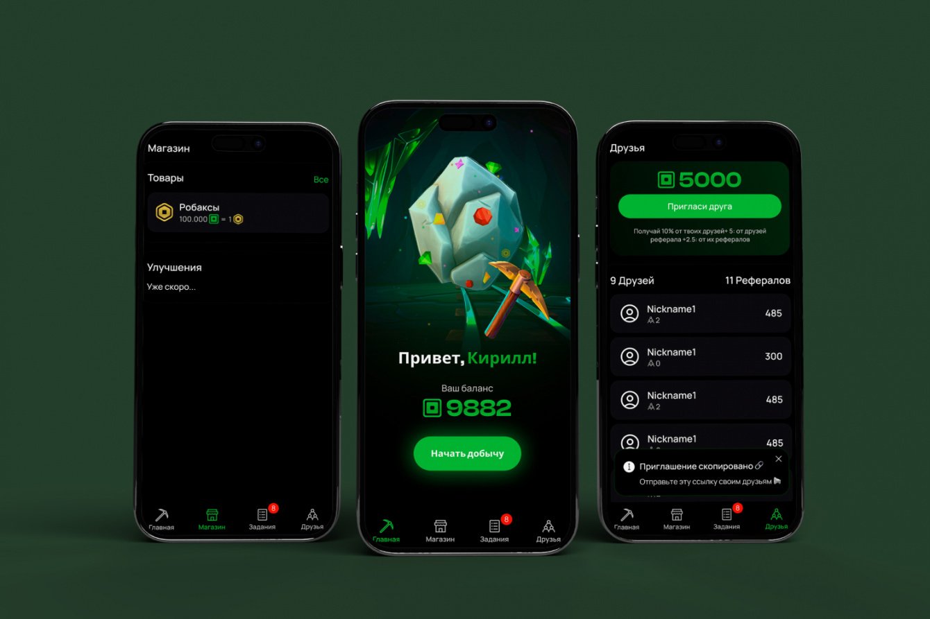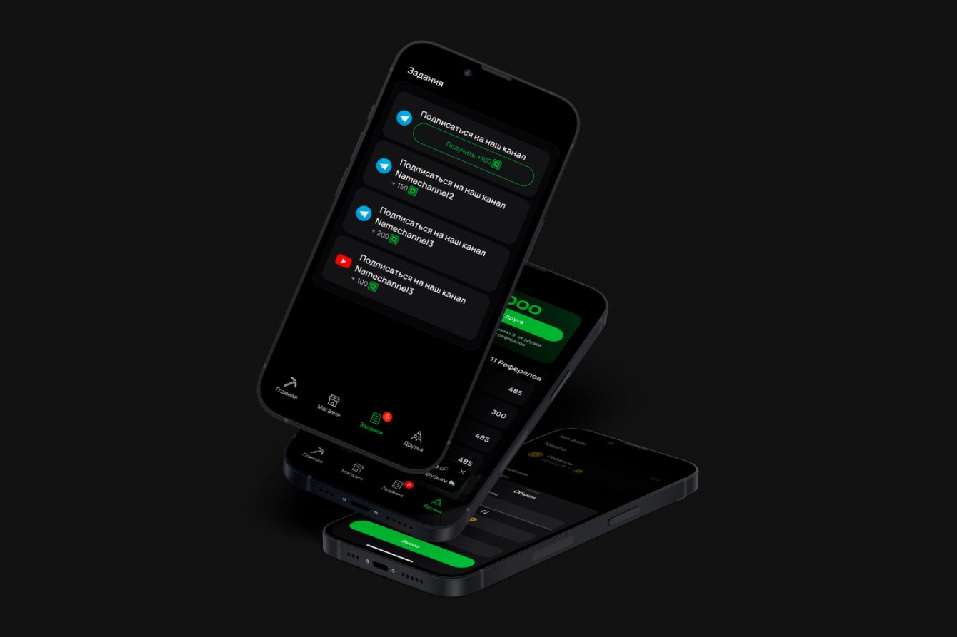 Вторым этапом была разработка основного экрана с майнингом. Была создана функция майнинга, добавлены три кнопки снизу "Задания", "Друзья", "Магазин". Была разработана архитектура бота, начата работа над частью функций админ-панели в Strapi. Была создана база данных для хранения информации о игроках.