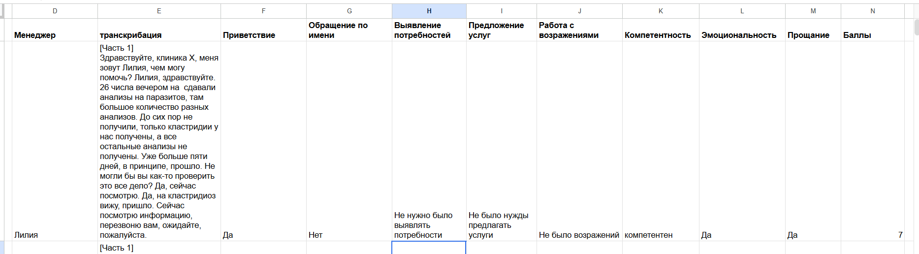 Подключили транскрибацию + чек-лист оценки (приветствие, обращение по имени, выявление потребностей, предложение услуг, работа с возражениями, компетентность, эмоциональность, прощание) + итоговый балл.