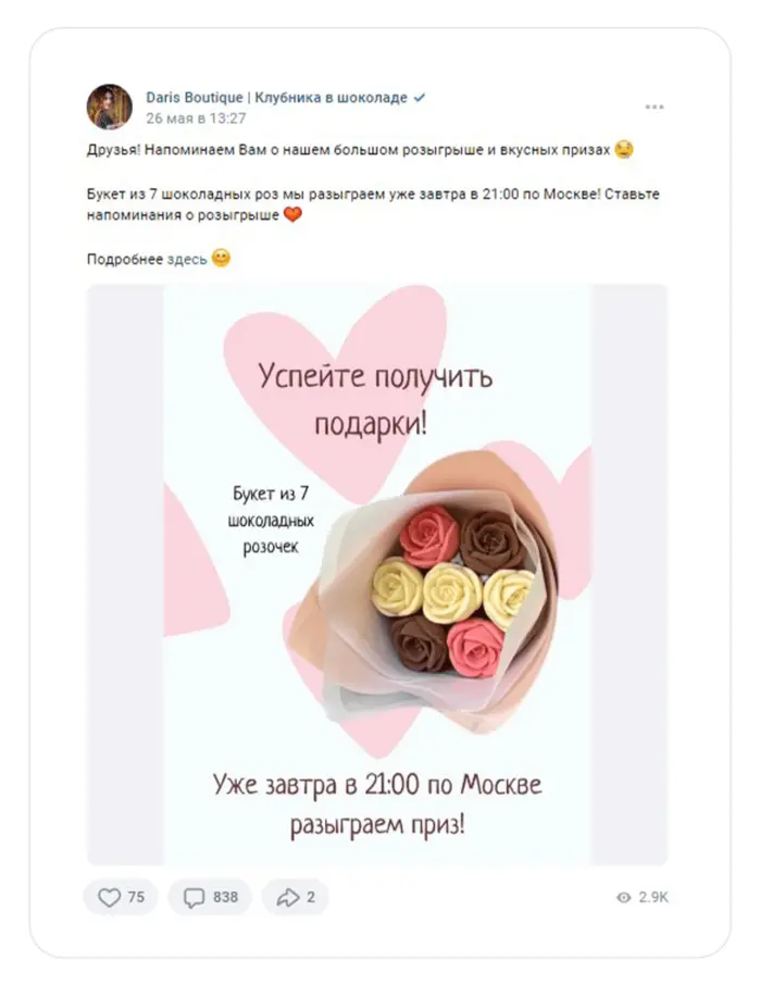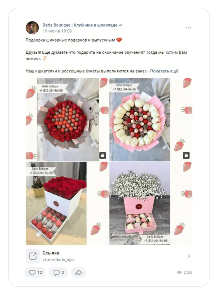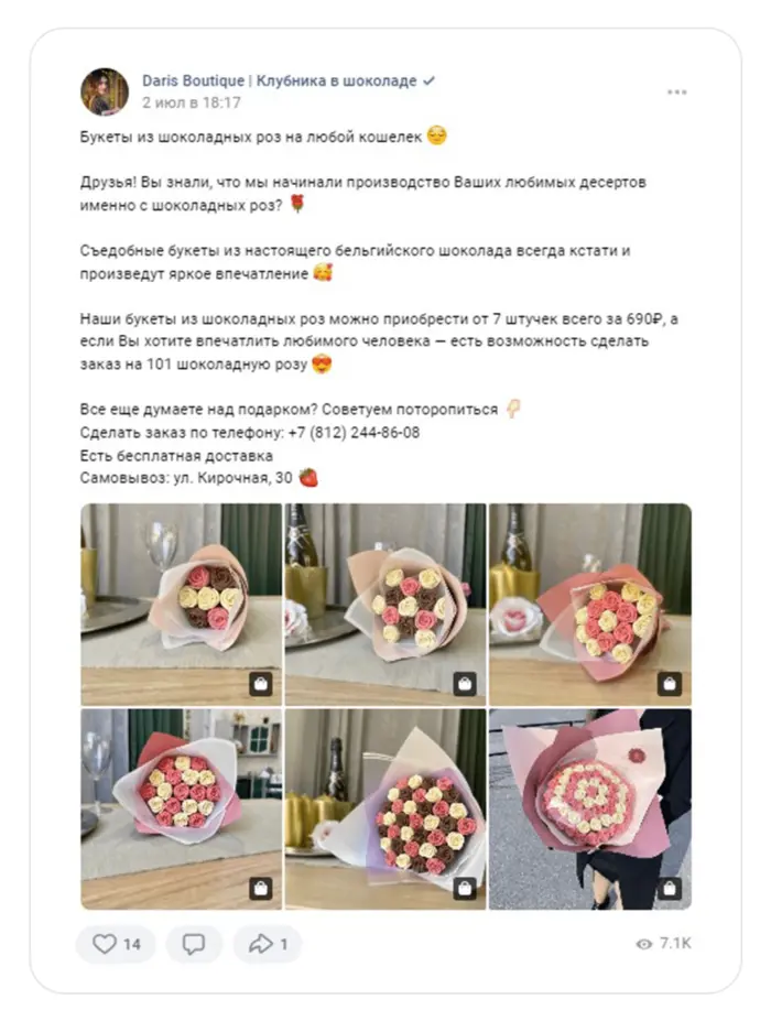 Адаптация объявлений помогает вызвать больше доверия у подписчиков. Например, в сообществе, где публикуются новости Питера, подали информацию, как актуальное событие города. А не просто рассказали, о возможности порадовать себя и своих близких букетом из шоколадных роз. Формат объявления соответствовал публикациям паблика, и некоторые люди даже не заметили, что это реклама.