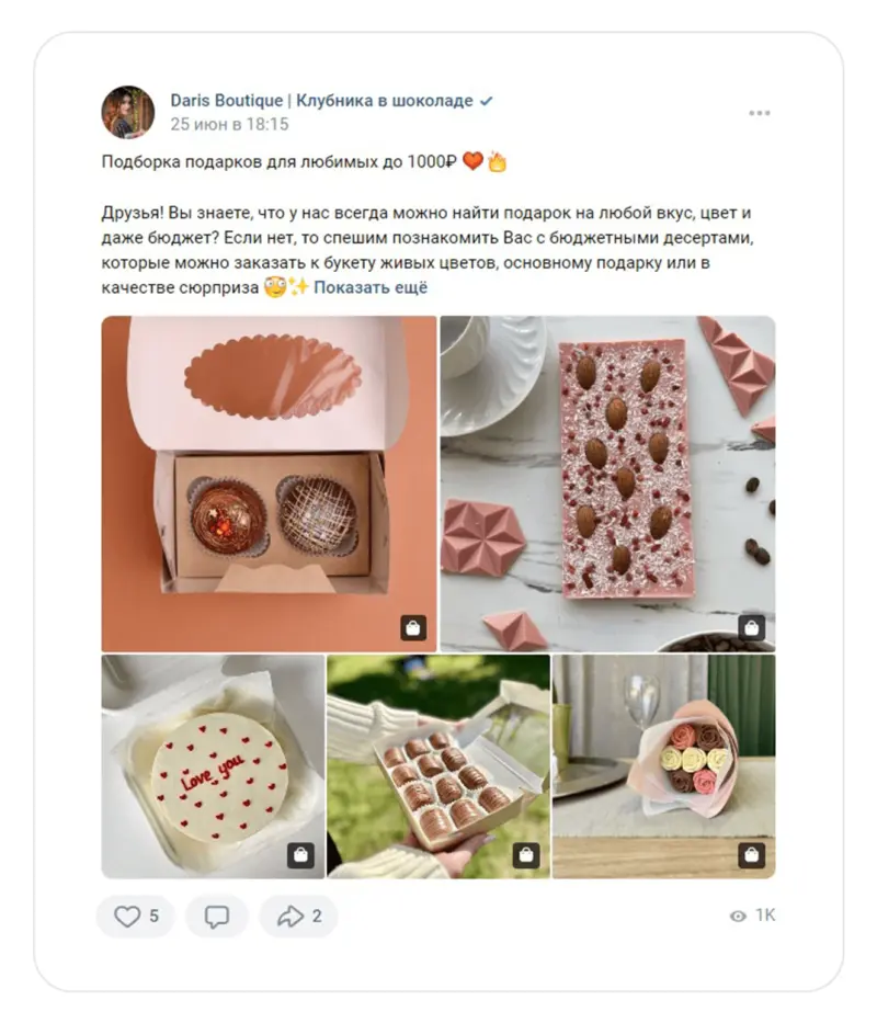 Тематические подборки. За месяц до праздничных событий делать посты с тематическими подборками букетов, которые подойдут к празднику. Например, на 8 Марта, ко Дню матери, на выпускной или подарки не выше 1000 р. Такие подборки можно использовать в рекламе на теплую и на холодную аудиторию.