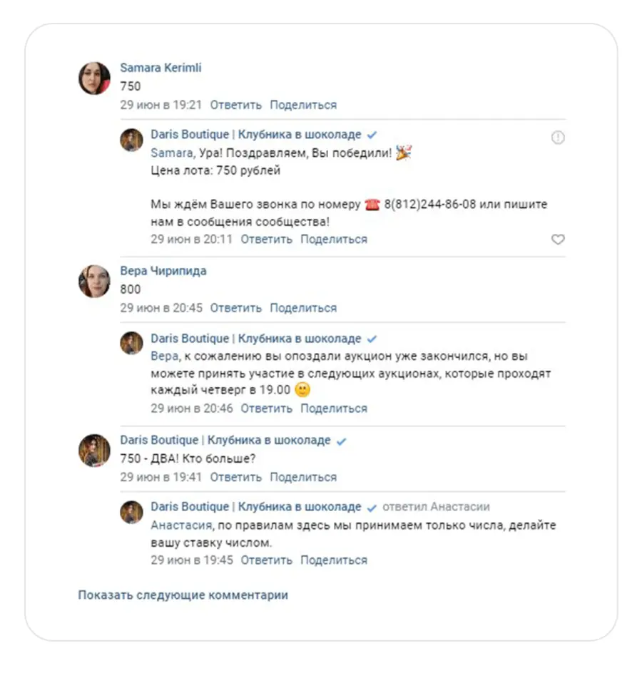 Для повышения активности в группе и роста продаж запустили аукционы. Заметили, что аукцион стоит запускать регулярно: в один и тот же день недели и время. Тогда люди привыкают к событию и ждут проведения аукциона.