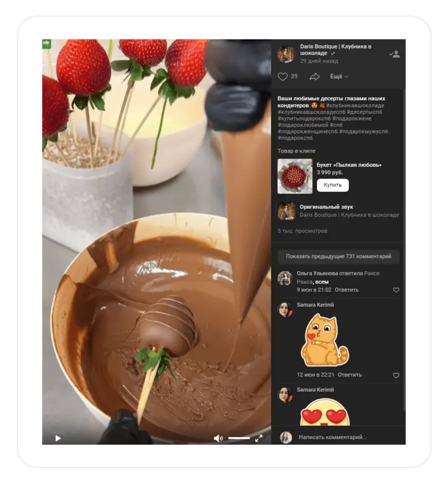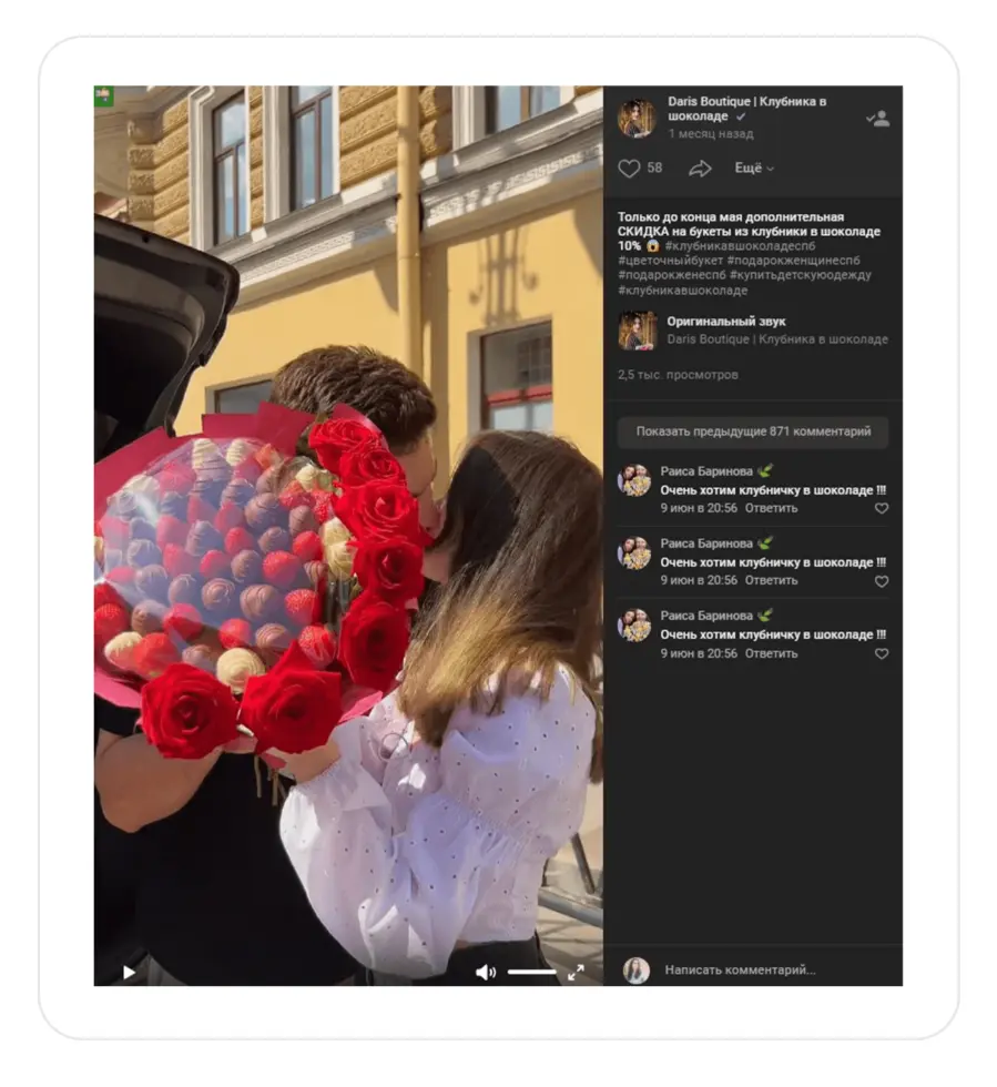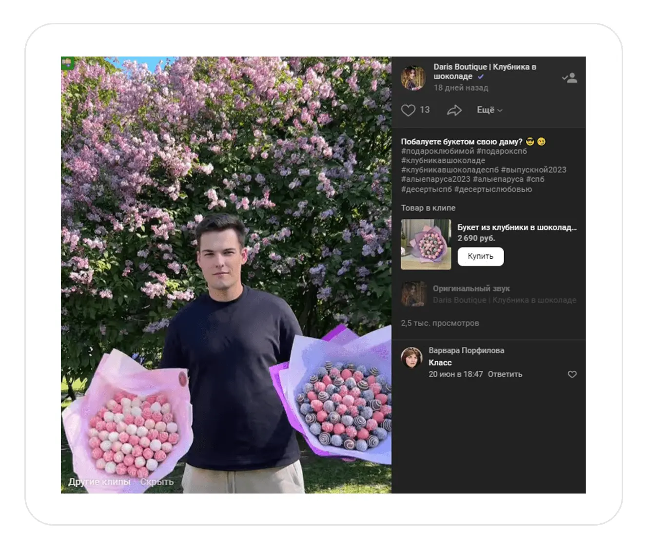 Клипы. Записывать трендовые видео под популярную музыку и размещать в разделе «Клипы». В роликах можно показать реальный размер букета, процесс создания клубники в шоколаде или эмоции, которые вызовет подарок у получателя.