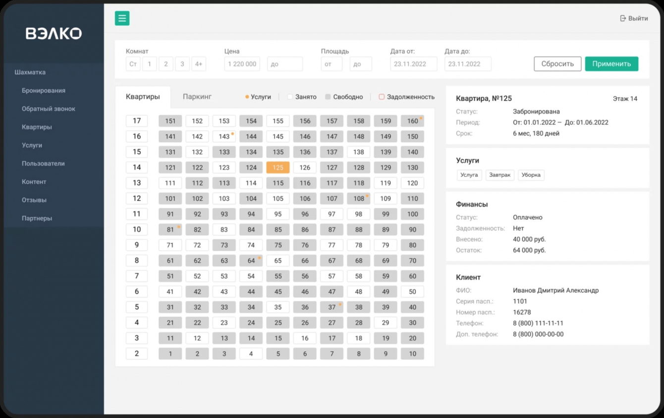 А вот тут самое интересное! В админпанели мы разработали шахматку, но шахматку нетипичную — похожую на ту, что встречается в киноатеатрах, где зритель бронирует места онлайн. Только при нажатии выводится информация о пользователе, который проживает в этой квартире.