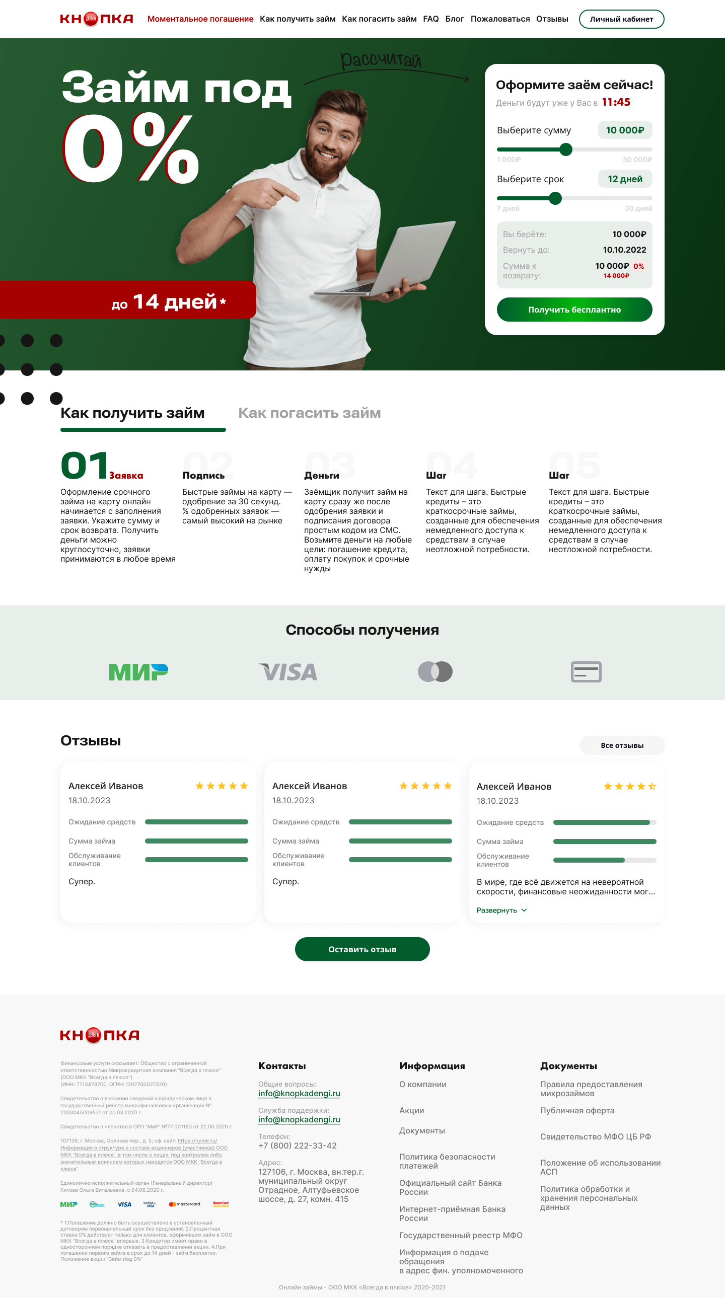 — Главная страница: акцент на УТП «Займ под 0%», простая форма входа, блоки с преимуществами, отзывами и способами получения.