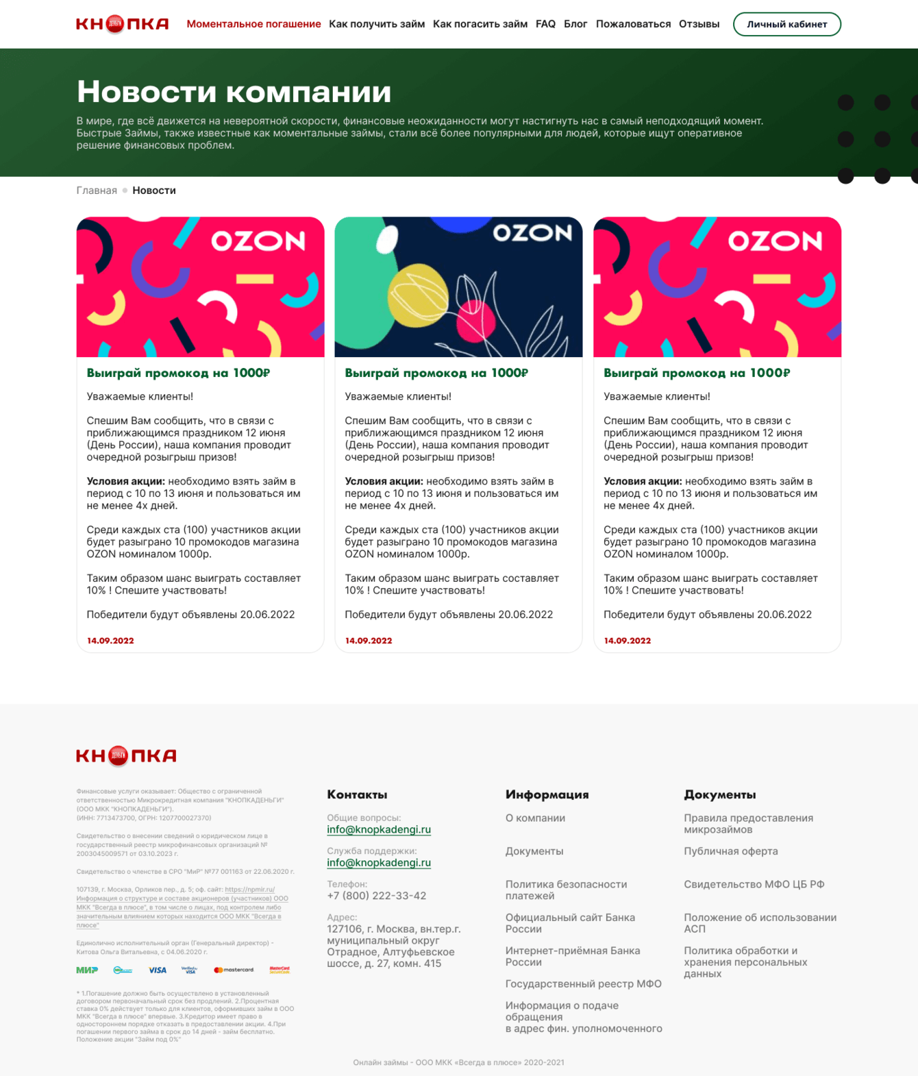 — Новости и статьи: SEO-контент, информирующий о партнёрствах, новостях сервиса, экономике.