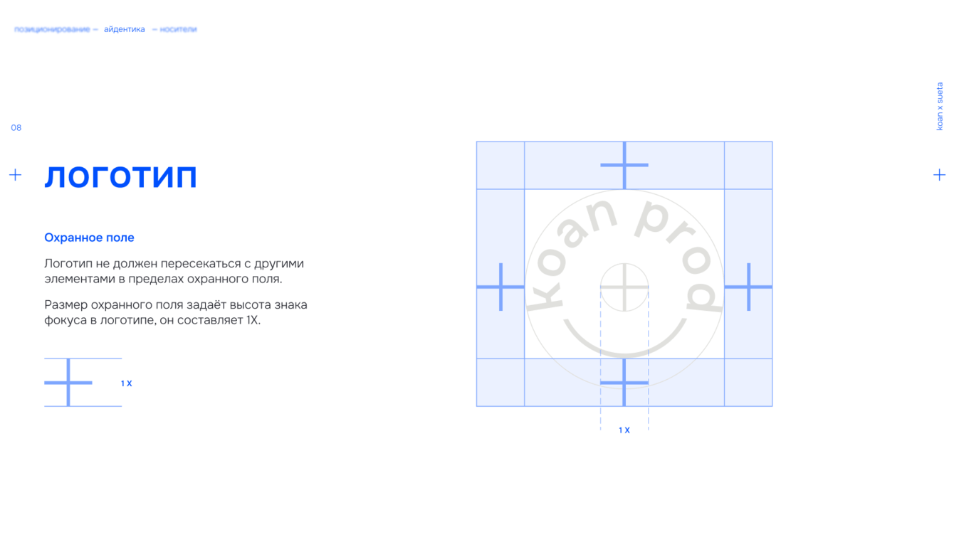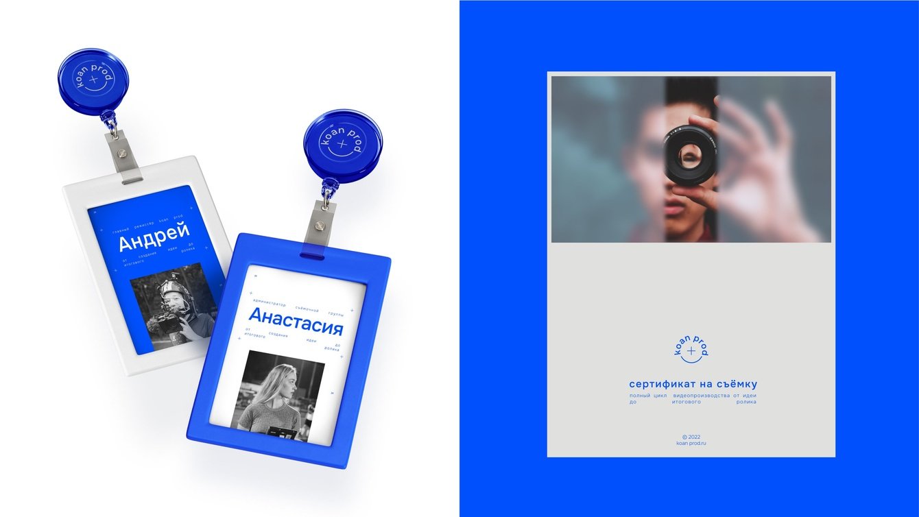 Мы разработали новый фирменный стиль, который визуально ассоциируется с объективом камеры. В его основу легли два приёма видеосъёмки — фокусировка и размытие. Это символизирует концентрацию команды на главных вещах в каждом кадре. Стилеобразующий элемент — крестообразная точка фокуса на видоискателе. Точно так же Koan prod попадает в цель проекта, делая работу с вниманием к деталям и качественным результатом.