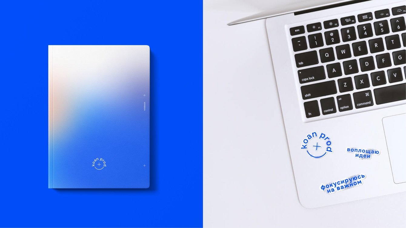 Но я лучшая часть работы — видеть, как брендинг живёт не только в Figma. Ребята из Koan prod пользуются визитками, макетами и носят мерч с нашим дизайном.