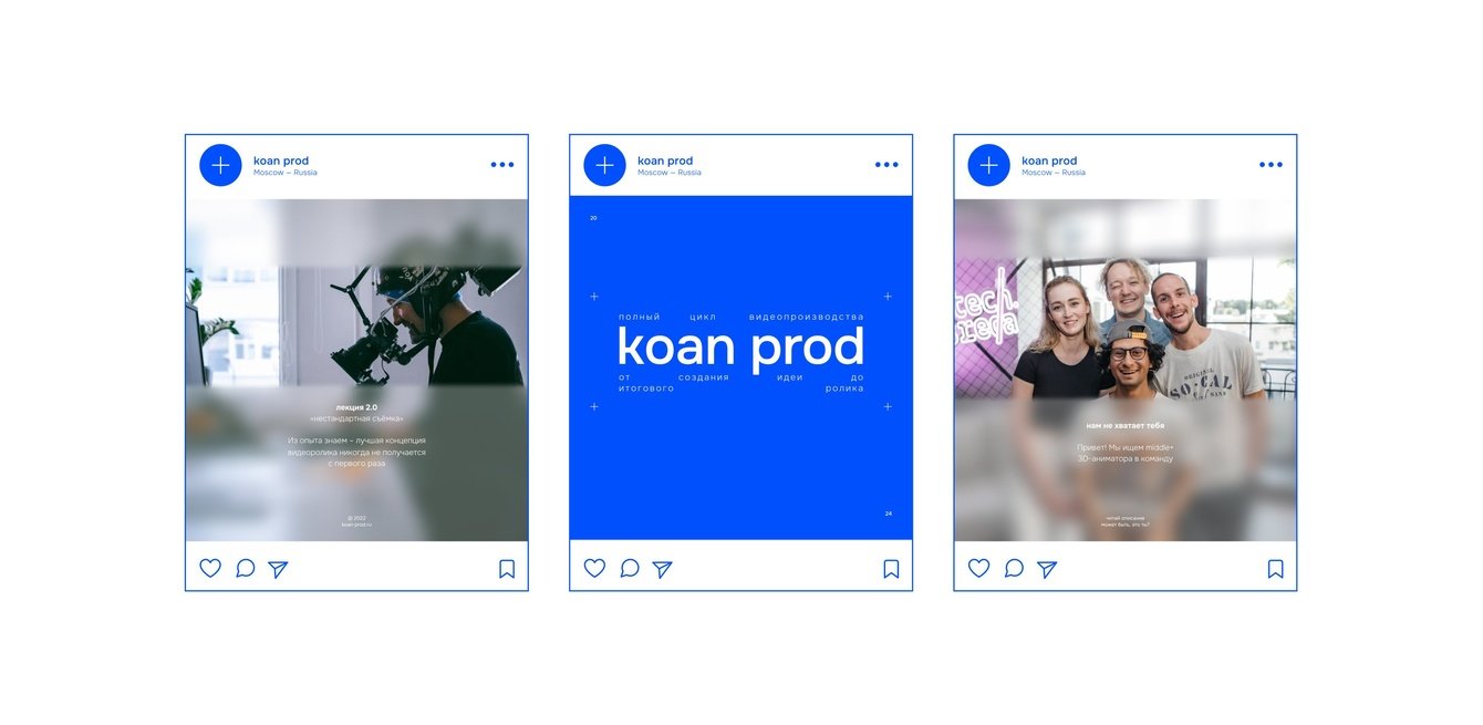 Обычно мы исследуем все составляющие бренда: аудиторию, конкурентов и индустрию в целом, тренды. Чем меньше у клиента знаний о компании, тем глубиннее исследование. Например, если компания только открывается и нащупывает свою ЦА и тренды, мы изучаем всё. Если же команда клиента давно на рынке и это ребрендинг, нам достаточно провести дизайн-аудит конкурентов, а остальные данные у компании уже есть. В случае с Koan prod мы исследовали конкурентов и нишу видеопродакшена. Нам было важно отличаться от других агентств, но при этом сделать понятным аудитории.