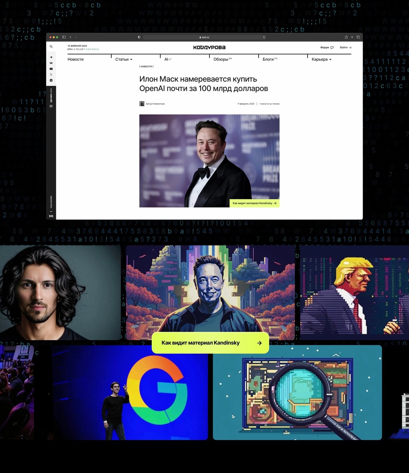 Любопытная вовлекающая фишка. Здесь всё довольно просто: читатель нажимает кнопку «Как видит новость Kandinsky», далее нейросеть анализирует текст статьи и генерирует иллюстрацию к нему.