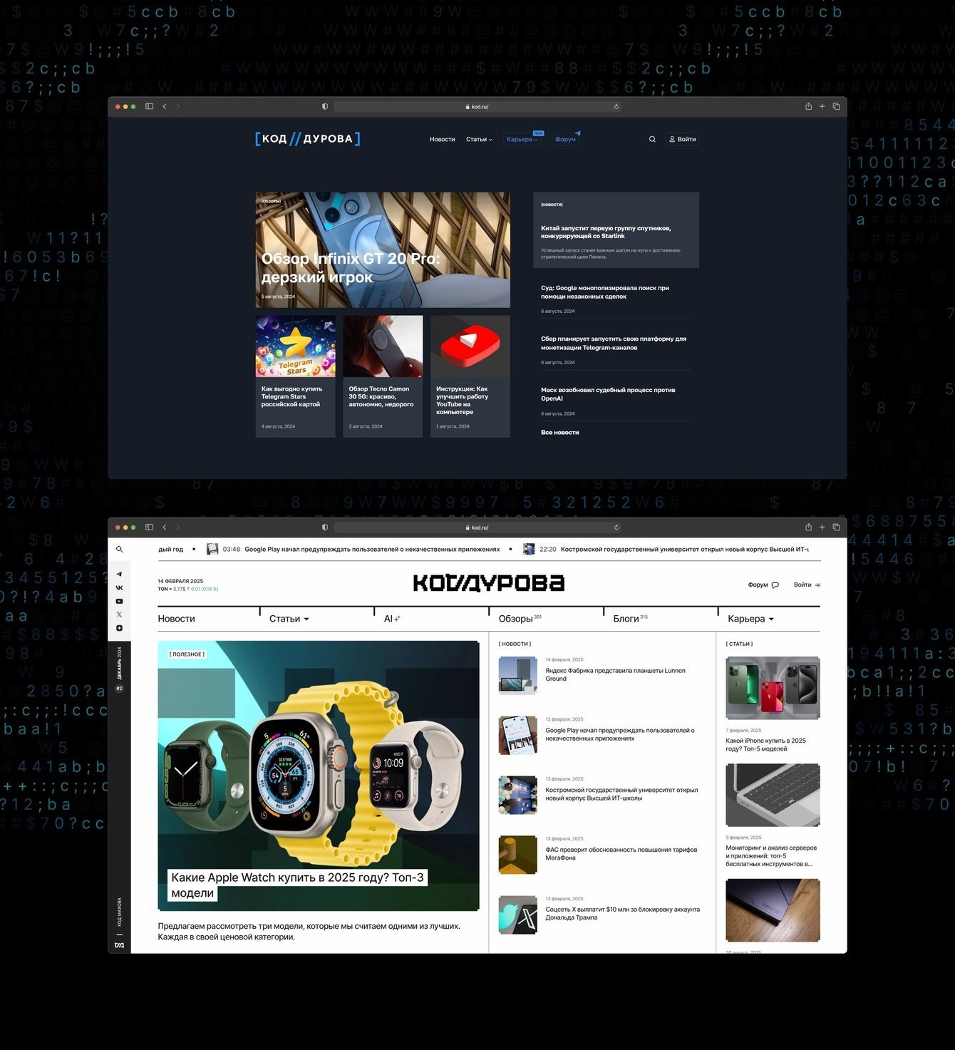 У нашего заказчика два сайта: русскоязычный Код.ру и англоязычный DurovsCode. Мы взялись за масштабную переработку обоих: добавили новые функции, улучшили дизайн и доработали концепцию, предложенную заказчиком.