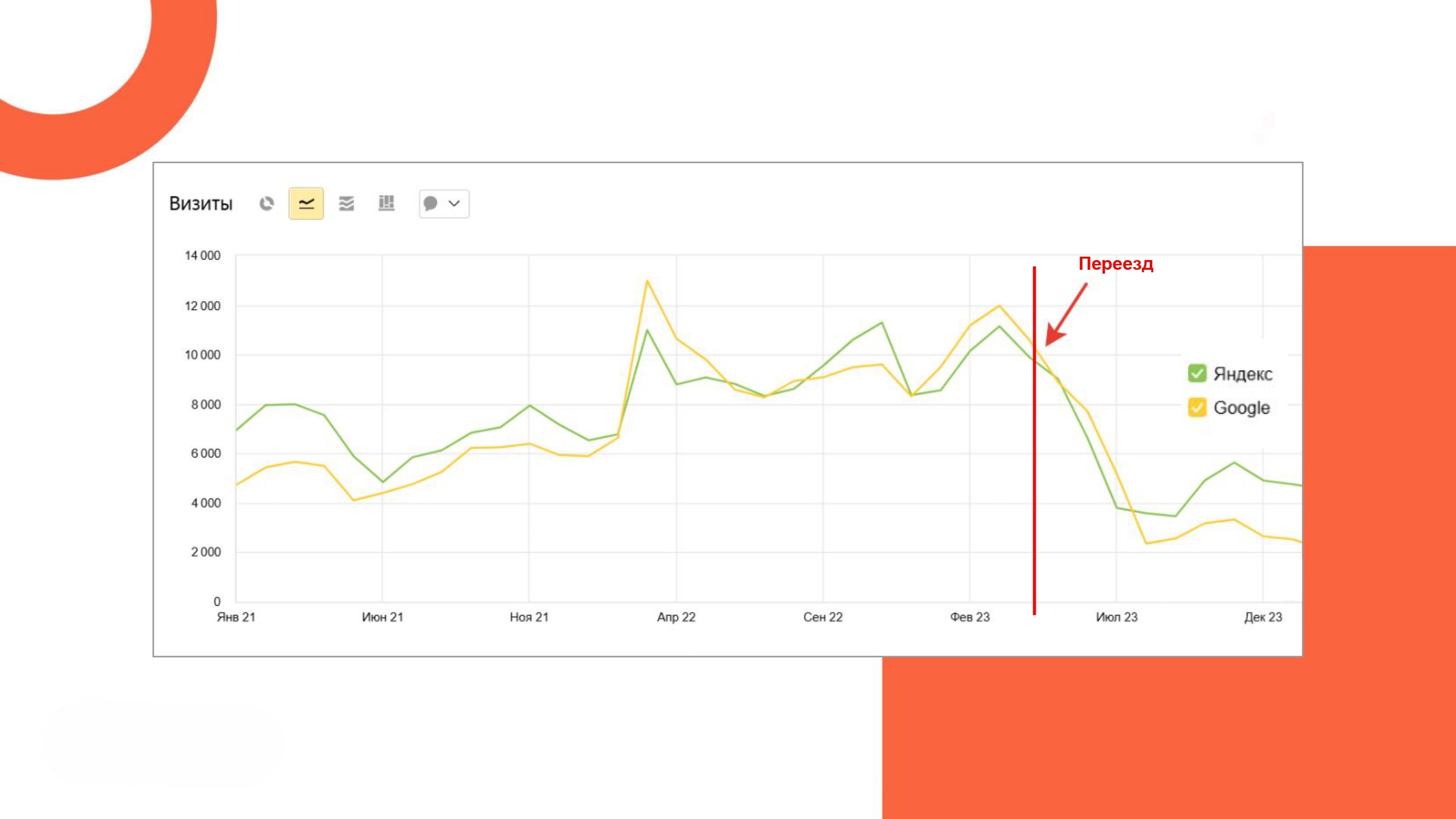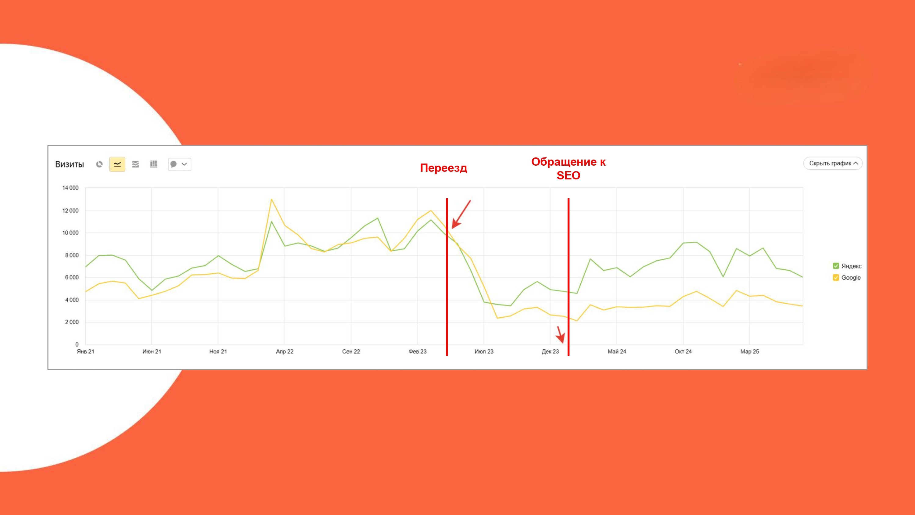 - Сравнивали текущий трафик с данными 2022 года (до переезда), чтобы видеть реальный прогресс с учетом изменений спроса в нише.