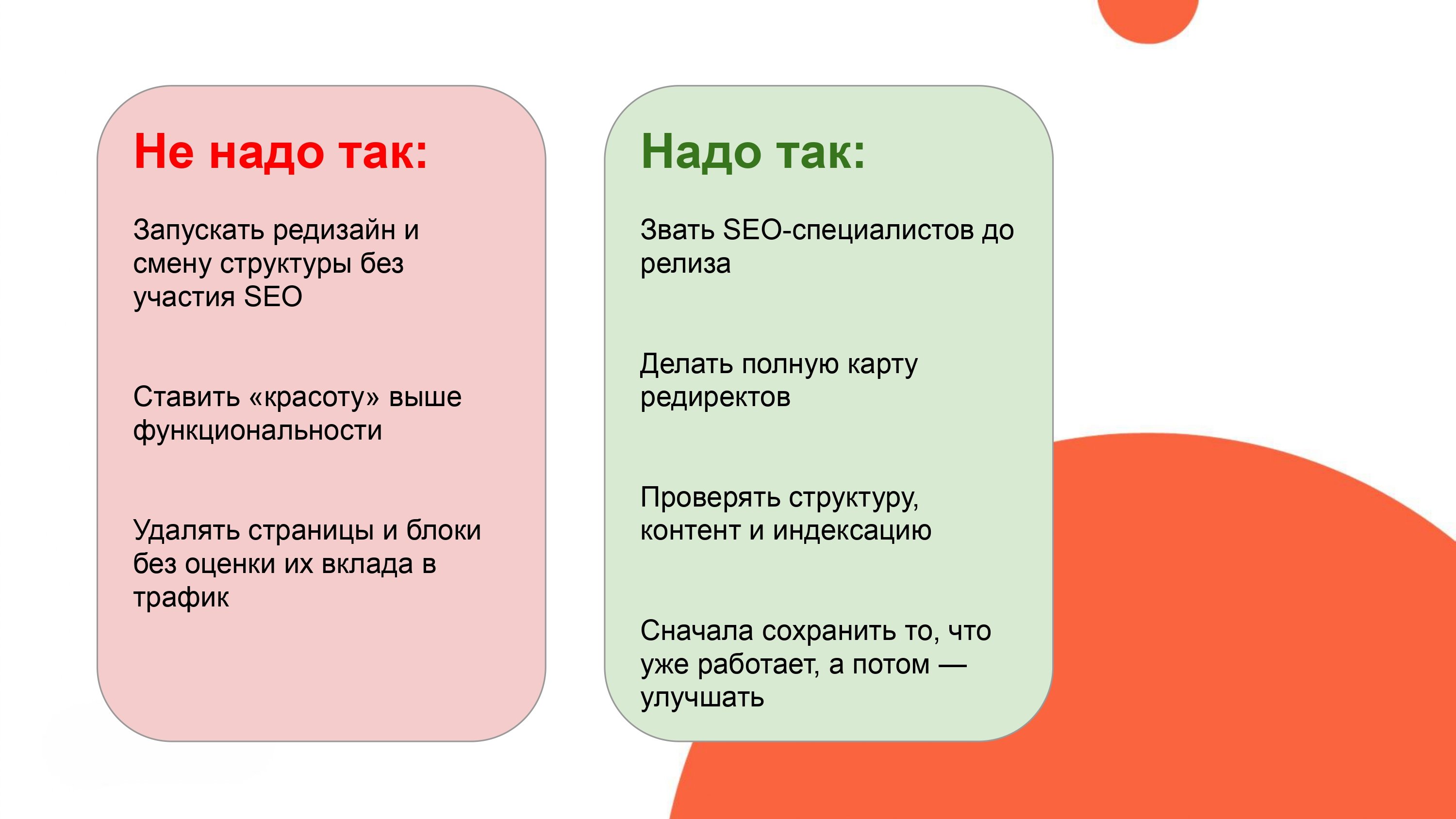Иногда достаточно одного пункта из левой колонки, чтобы трафик обвалился на месяцы. А чтобы восстановить его, приходится возвращать утерянные страницы, чинить структуру и объяснять поисковику, что вы все еще на месте.