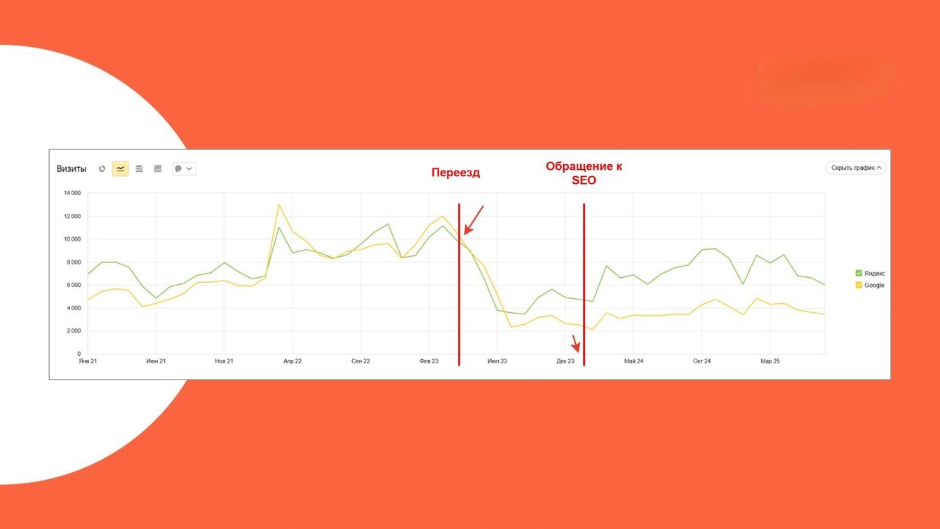 Клиент пришел к нам на SEO спустя почти год после переезда. Да, часть позиций ушла безвозвратно, но трафик еще можно было спасти.