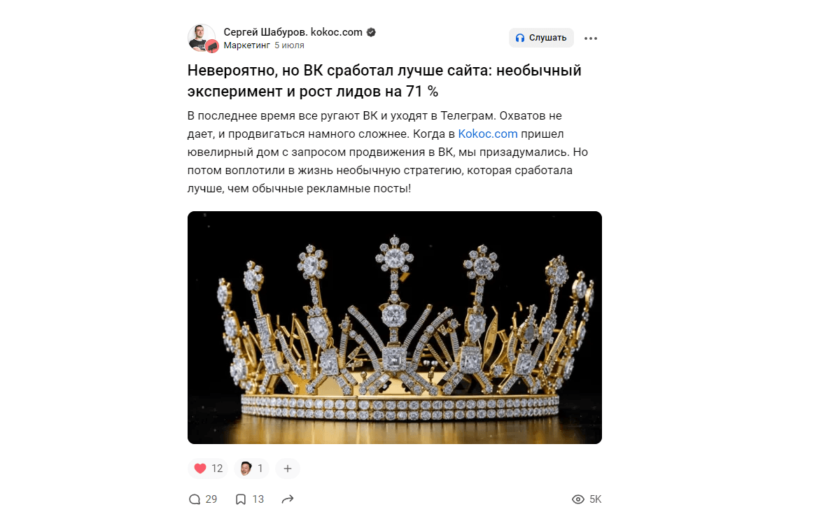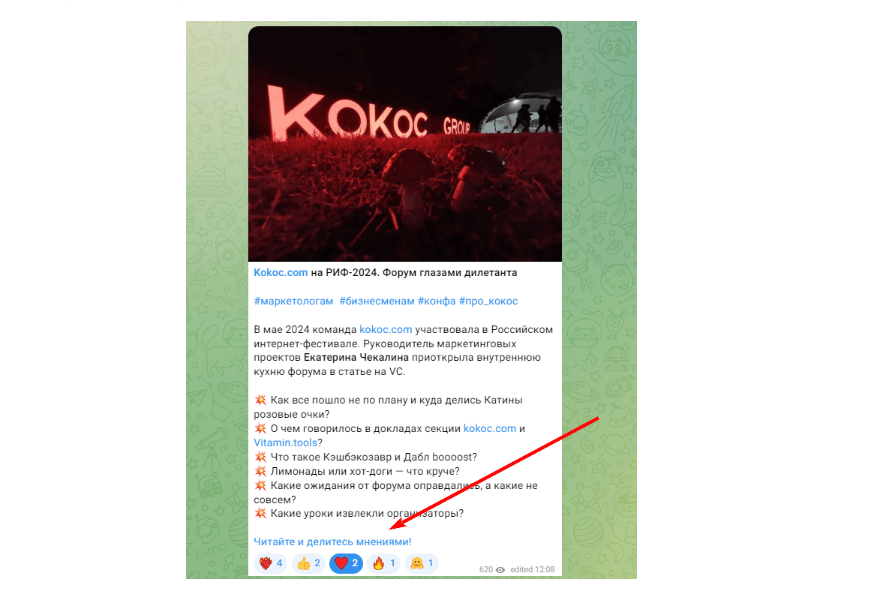 Мы всегда дистрибутировали материалы — периодически размещали статьи и кейсы на внешних площадках, примерно по 1-2 в месяц. Также у Kokoc.com были соцсети — ТГ-канал, паблик в VK. Но стройная система дистрибуции начала создаваться только с начала 2024, когда этим занялась руководитель маркетинговых проектов Екатерина Чекалина.