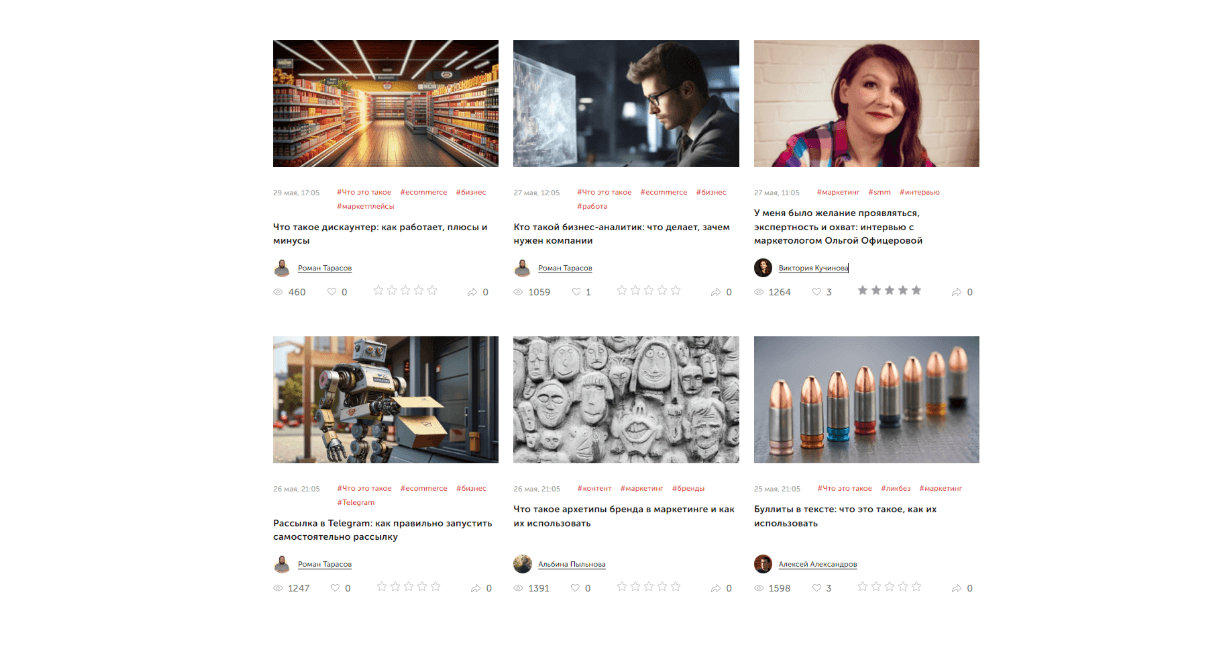 В превью отображаются количество просмотров, лайки, оценки, репосты. Каждой статье присвоены теги, что облегчает поиск по блогу.