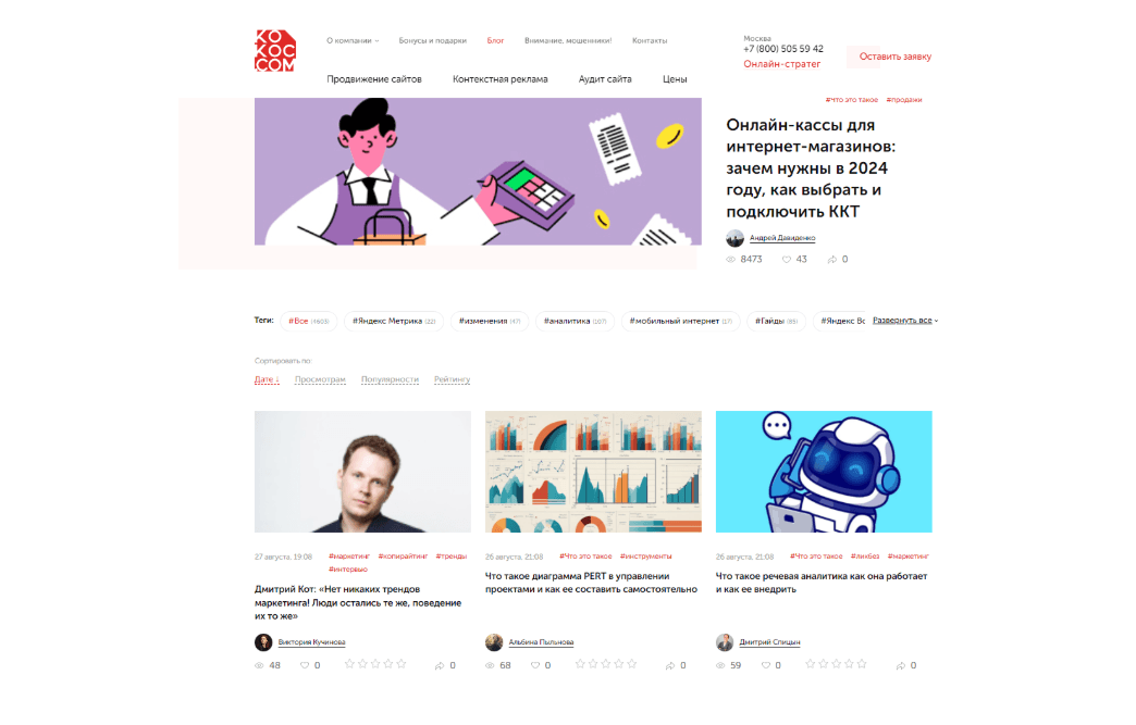 В первые месяцы мы много и активно писали про классическое SEO, про услуги Kokoc.com, даже развлекательные статьи были. Вот они, первые статьи блога Kokoc.com. Оцените общее количество материалов — в блоге уже под 1000 статей!