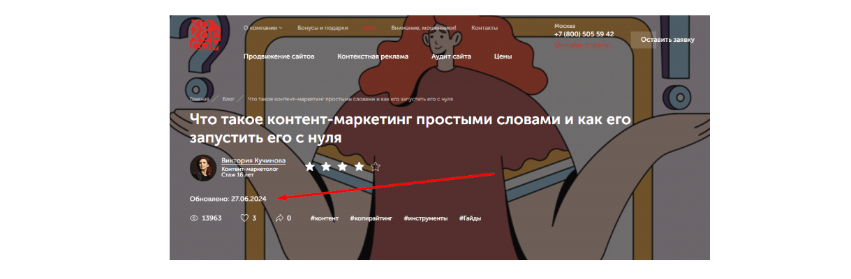 Также регулярно обновляем статьи: наша сфера изменчива, то, что было актуально 3 года назад, сейчас может устареть. Например, в статью про контент-маркетинг, написанную в 2022 году, недавно добавили информацию про тренды-2024: