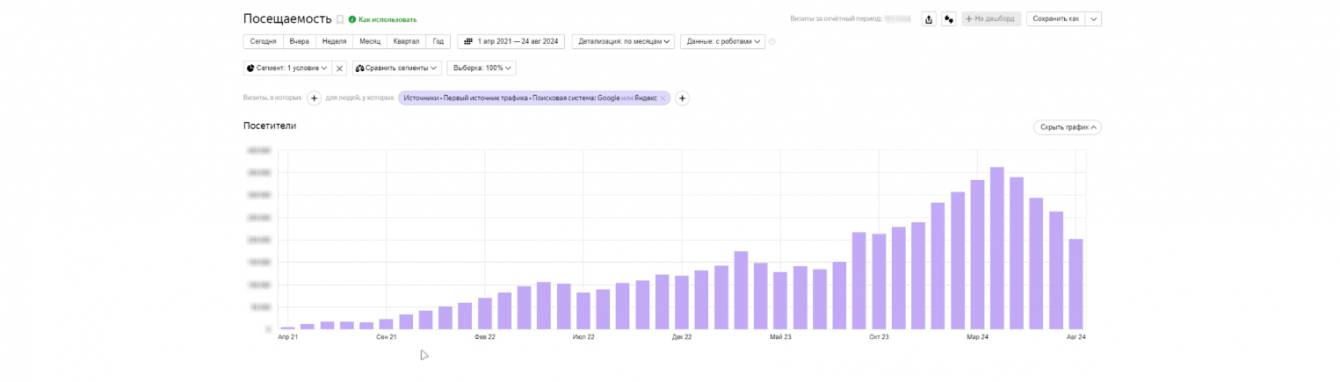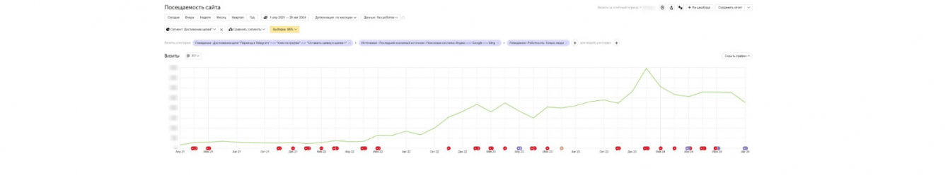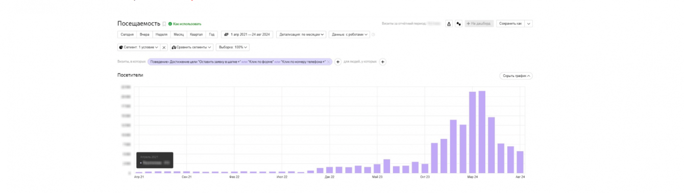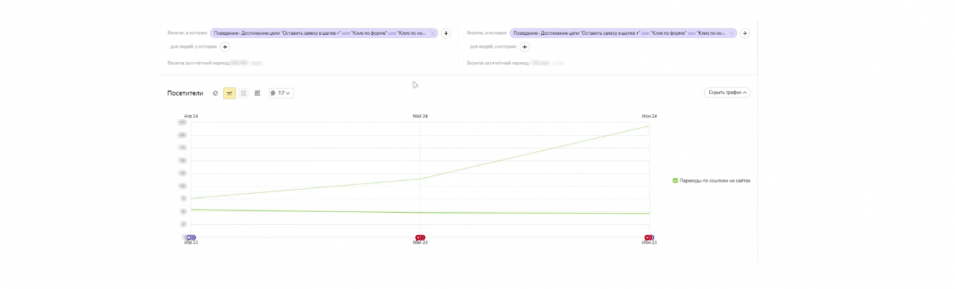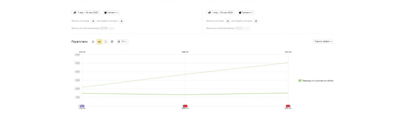 Также сравнили данные по второму кварталу 2023 года и второму кварталу 2024 года. Количество целевых посетителей выросло квартал к кварталу в 2,72 раза