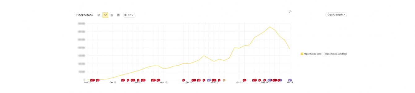 Теперь смотрим конкретно блог kokoc.com/blog. Поисковый трафик в блог с апреля 2021 по апрель 2024 увеличился в 241,2 раза! Это абсолютный рекорд и прямая заслуга нашей команды.