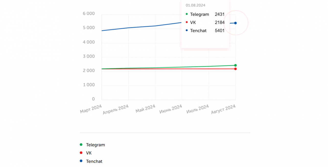 С марта по август 2024 мы обеспечили прирост подписчиков на 11,2 % в Telegram, на 0,3 % VK и на 11,08 % в Tenchat бесплатного трафика.