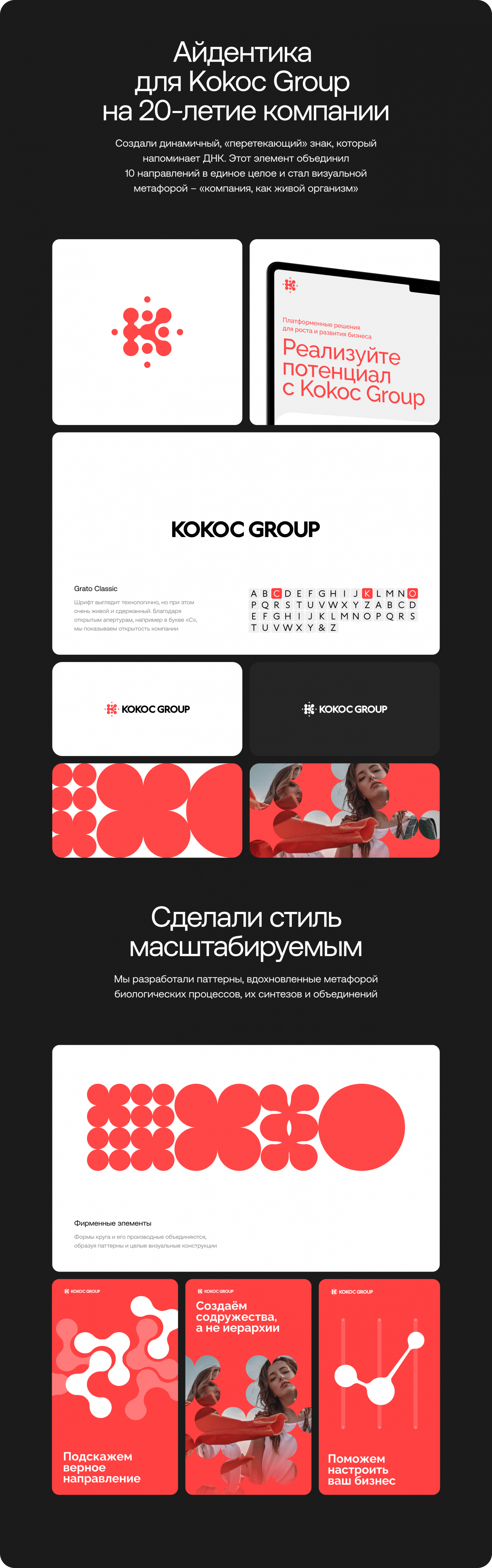 Создать айдентику, которая отразит масштаб, философию и ценности Kokoc Group. Мы стремились разработать визуальную систему, которая поддерживает новые бизнес-процессы и сохраняет узнаваемость бренда.