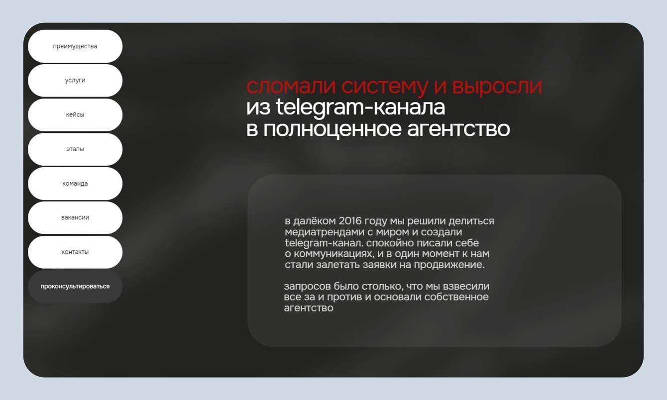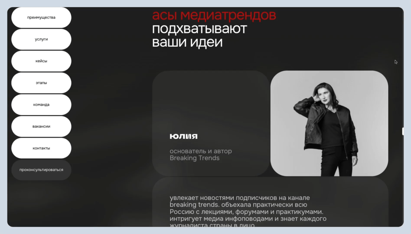 Добавили блок с рассказом о компании: как телеграм-канал вырос в полноценное агентство. Это фишка ребят. Обычно SMM-студии регистрируются, выходят на рынок, и только потом начинают вести соцсети. А у Breaking Trends получилось наоборот. Хотели делится трендами с подписчиками, но начали прилетать заявки на продвижение. Тогда и появилось агентство.