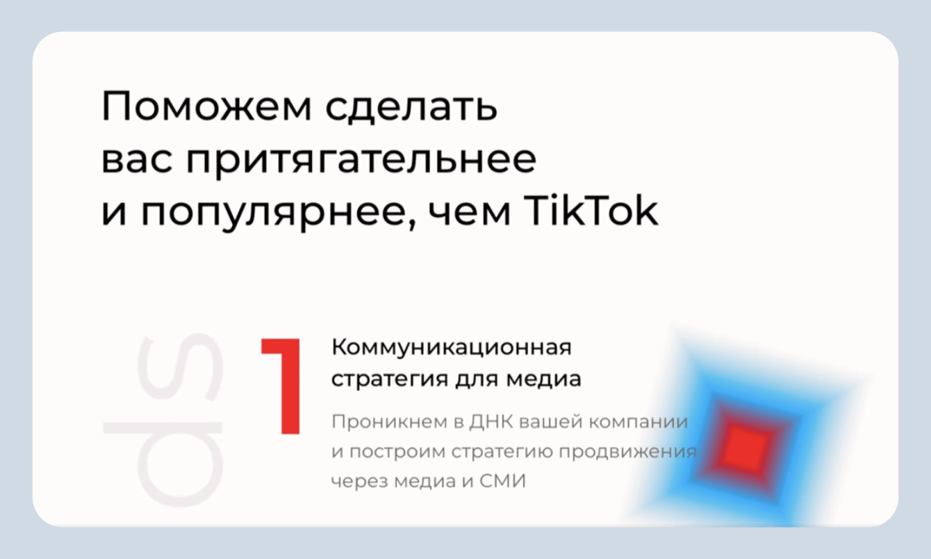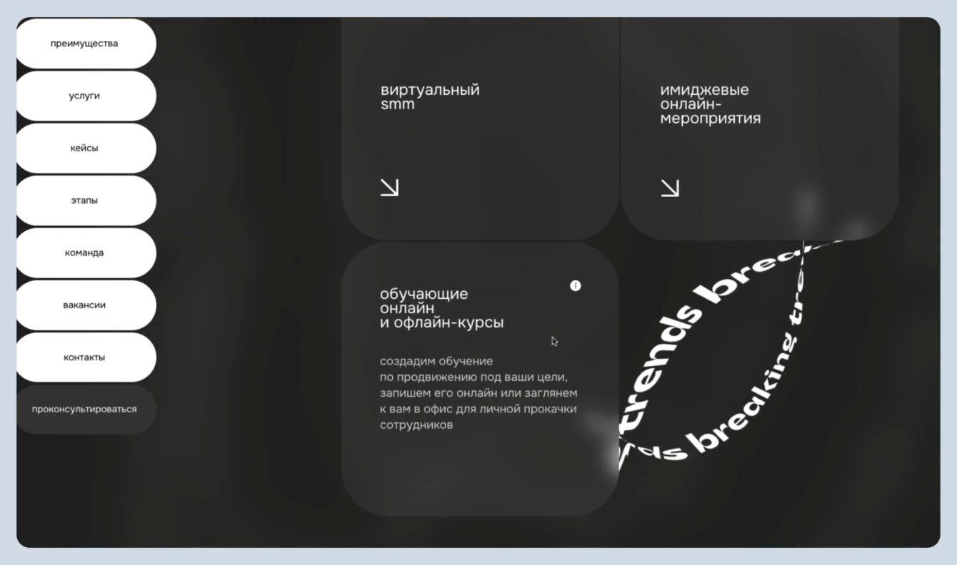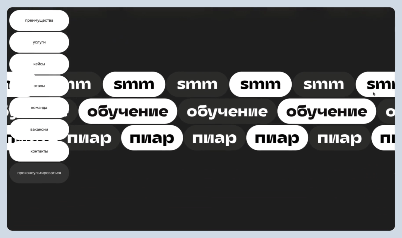 Уменьшили типографику и поместили «smm», «пиар», «обучение» на плашки. Это основные направления компании, поэтому в анимацию вынесли их.