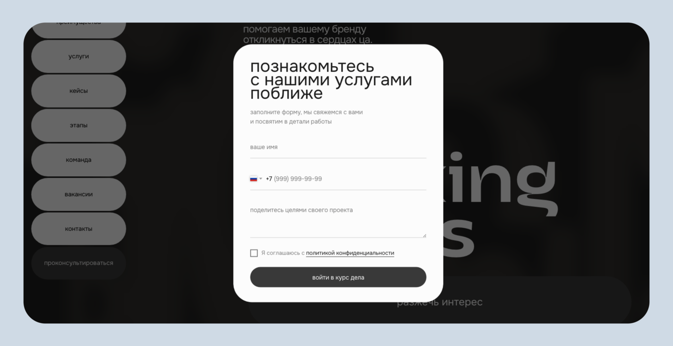 Конкретизировали этапы работы агентства, чтобы стало понятнее, чем оно занимается. На старом сайте было меньше конкретики, как происходит взаимодействие с клиентами. Это могло отталкивать холодных лидов.