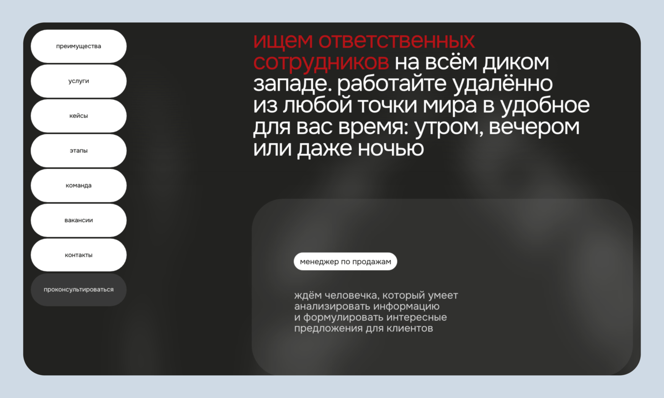 Старый сайт «подгонял» агентству новых сотрудников, хотя там не было ничего для соискателей. И раз компания создала такой фурор среди специалистов, решили добавить блок с вакансиями. Теперь не нужно «стучаться в личку», чтобы стать частью команды. Достаточно кликнуть на кнопку и заполнить форму.