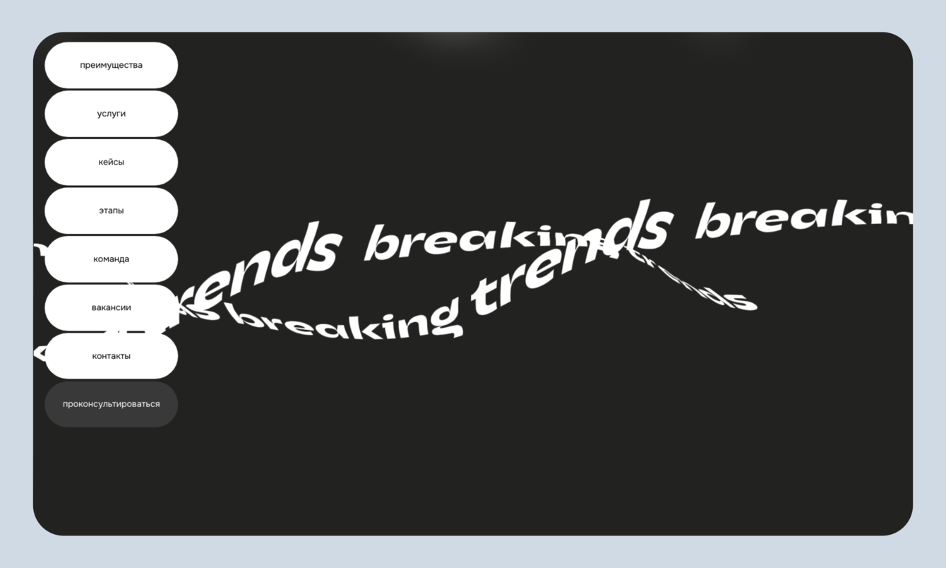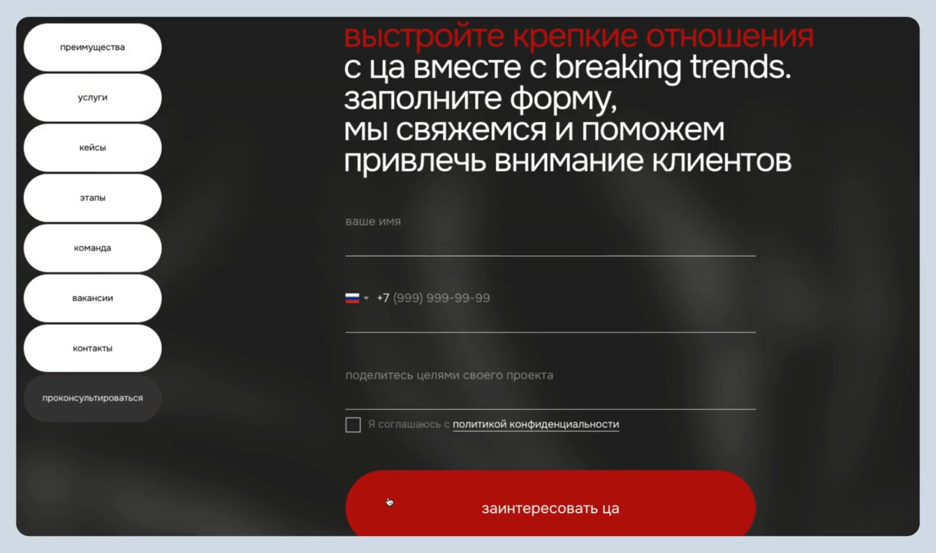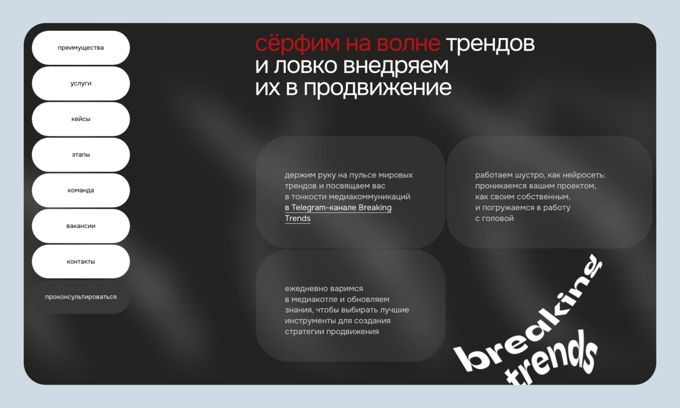 Лендинг пронизан айдентикой компании. В каждом блоке используется их название — Breaking Trends. В анимации, на фоне и в небольших элементах. Так мы показали «вездесущность» ребят. Всё-таки они работают по многим каналам, варятся во всех трендах и громко о себе заявляют.