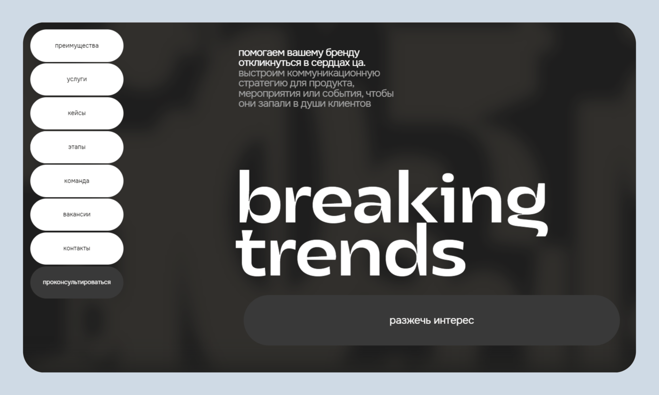 3 года назад мы сделали сайт для digital-агентства Breaking Trends. Ребята занимаются продвижением проектов, людей, мероприятий в социальных сетях и построением коммуникации между брендами и их ЦА.