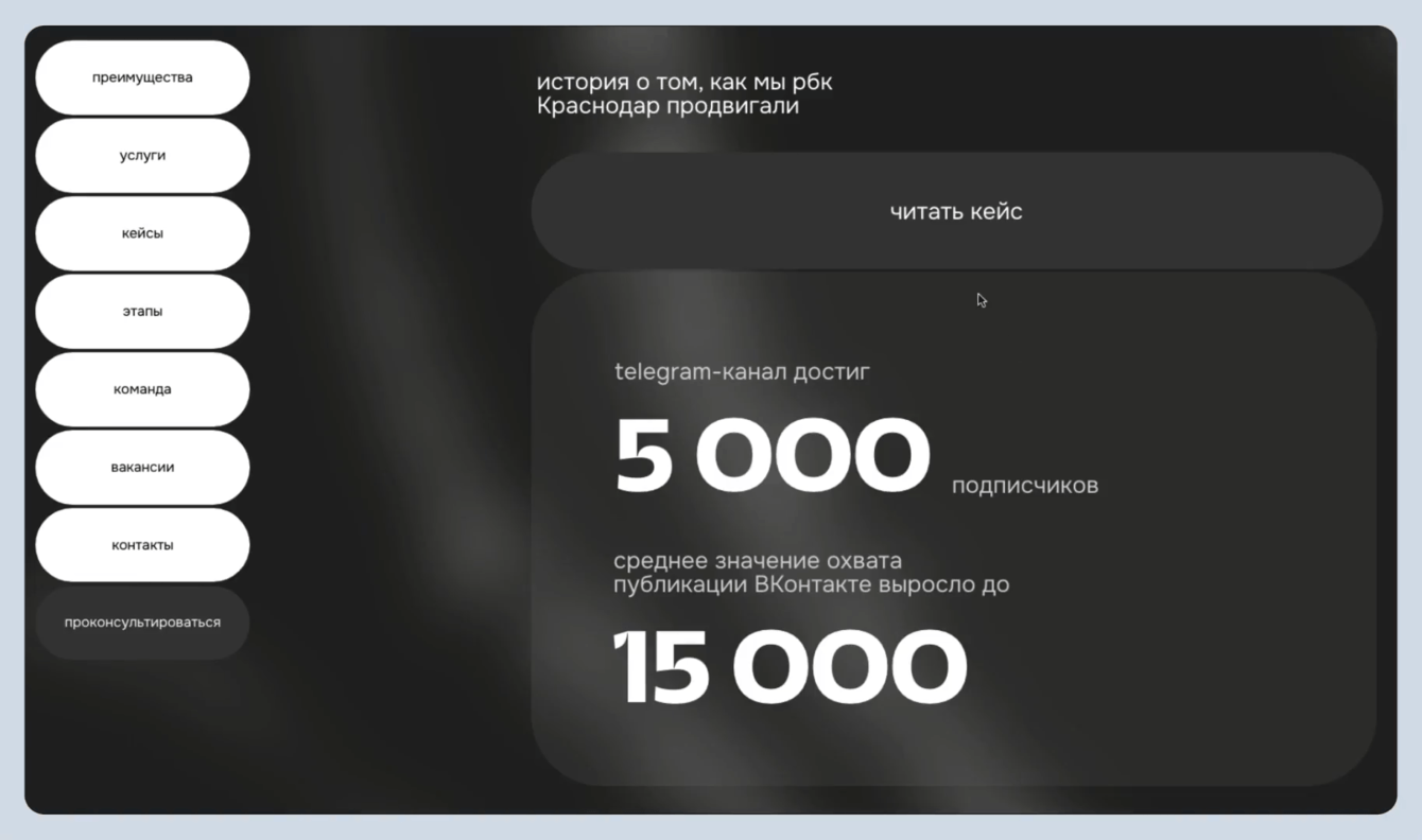 Дизайн прошлого лендинга был дерзким и трендовым. Но при этом сайт не приносил желаемую конверсию. Зато много кликов было на кейсы, потому что они цепляли оформлением: коллажами, анимацией и крупными цифрами. Одна из кнопок, на которую много нажимали — это переходы в соцсети.