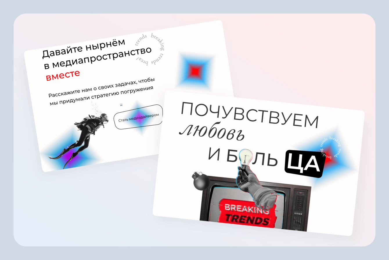 Плюс заказчик предположил, что прошлый сайт не соответствовал позиционированию компании. Breaking Trends — агентство для крупных брендов, с внушительным прайсом на услуги. Предыдущий лендинг выглядел неформально, чем, по мнению клиента, отпугивал серьёзных ребят и снижал конверсию. Но на тот момент заказчик хотел протестировать другую гипотезу: яркую историю в стиле Палиндрома.