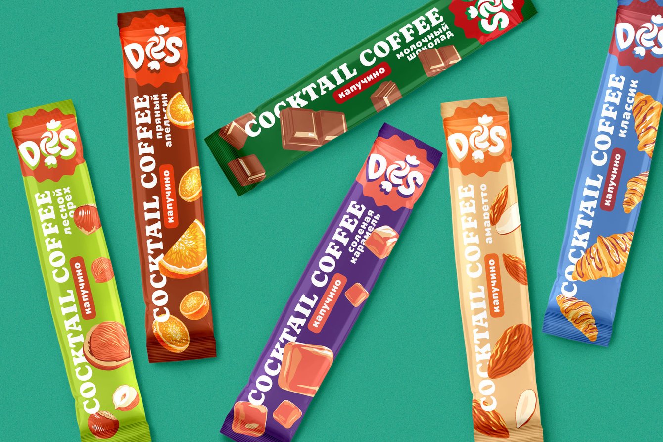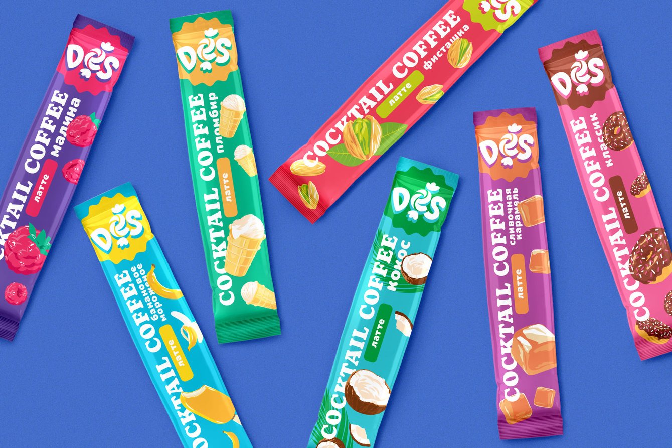 Стилизованные иллюстрации с насыщенной и контрастной цветовой гаммой, броские изображения ингредиентов в динамичных композициях, визуально акцентированная бренд-зона, вертикально расположенные текстовые блоки. Все это создает яркую привлекательную образность дизайн-концепции — и на шоу-боксы со стиками Des в магазине трудно не обратить внимание.