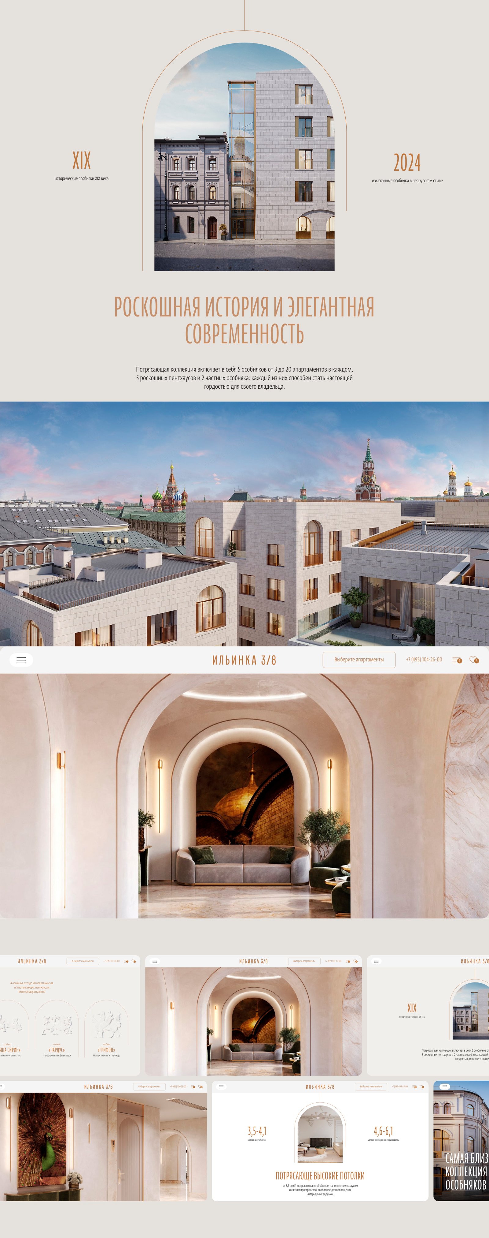 Создать сайт для коллекции клубных особняков «Ильинка 3/8» в самом сердце Москвы, у стен Кремля. Перед нами стояла амбициозная цель — не просто представить объект, а вплести историческую ткань XIX века в современную цифровую реальность. Задача состояла в том, чтобы дизайн и контент сайта говорили на языке роскоши, элегантности и исключительности, отражая уникальное расположение и историческую значимость проекта.