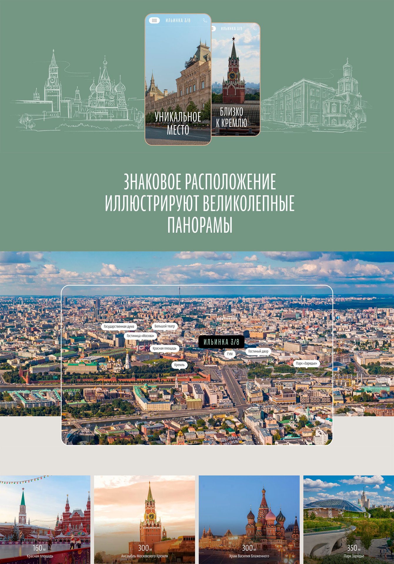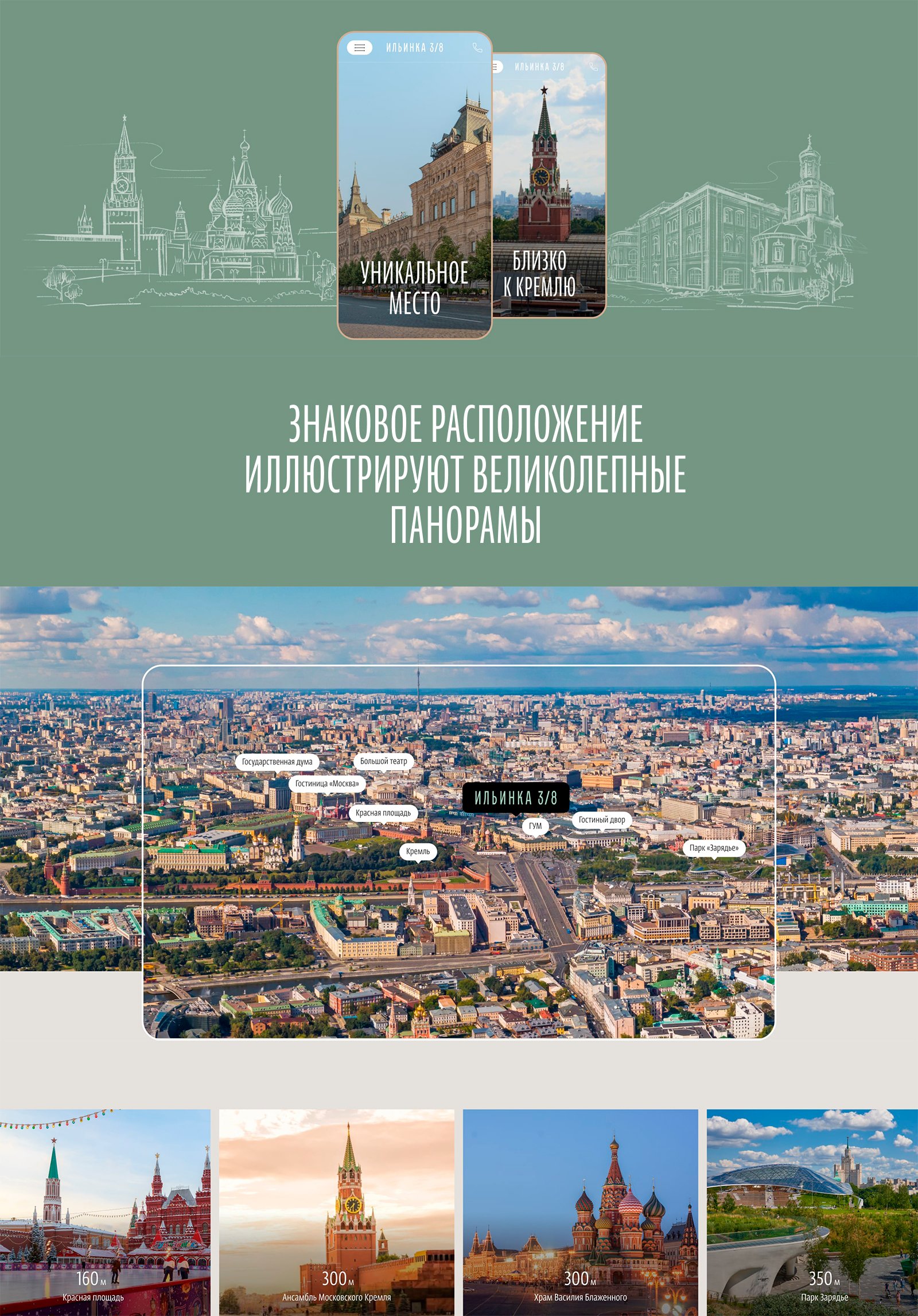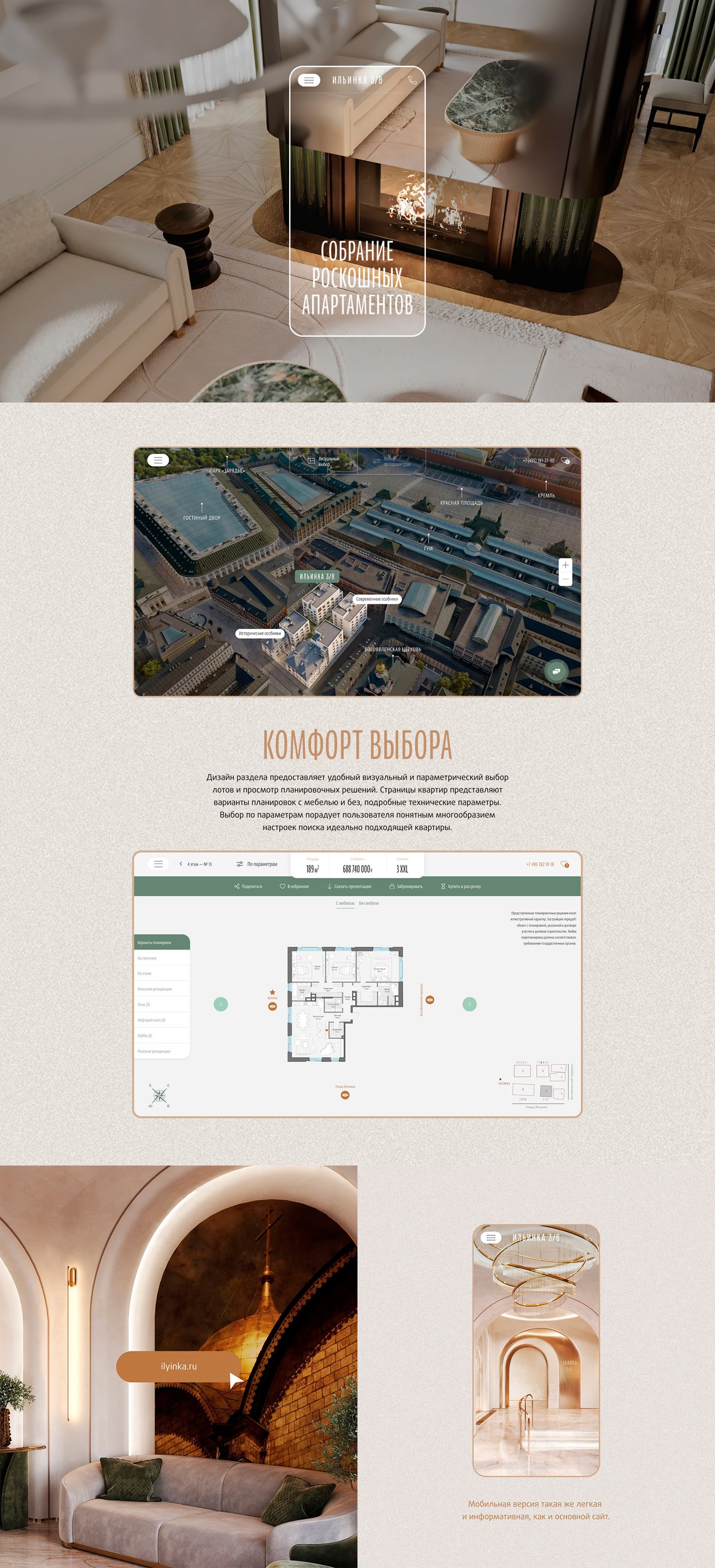В итоге, мы смогли гармонично соединить историческое величие с технологической элегантностью проекта «Ильинка 3/8», создав пространство, которое не только информирует, но и вдохновляет. Сайт стал не просто инструментом продаж, а продолжением самой концепции: здесь роскошь прошлого обретает новое воплощение в настоящем. Он безупречно работает как для десктопной, так и для мобильной версии.