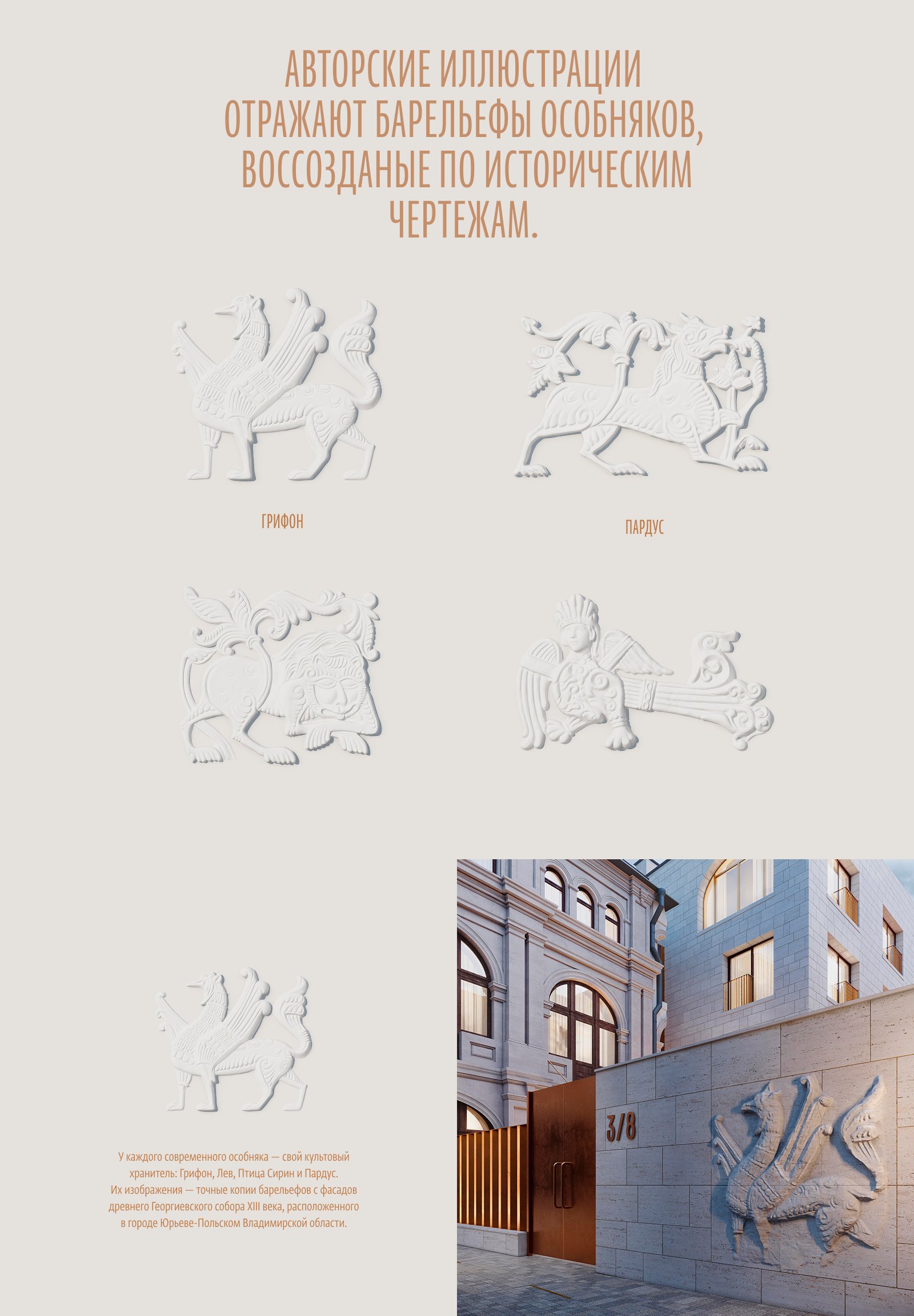 Чтобы глубже погрузиться в историю, мы отказались от шаблонных решений. Вместо этого мы использовали авторские иллюстрации, в основе которых лежат барельефы, скопированные с фасадов древнего Георгиевского собора. Каждый из них — это не просто украшение, а часть многовековой истории. Их символическое значение напрямую связано с культурным кодом: райская птица сирин олицетворяет счастье и благополучие, грифон — богатство, лев — благородство, а пардус — храбрость. Эти образы, кропотливо созданные владимирскими мастерами восемь веков назад, служат не просто элементом декора, а мостом между прошлым и настоящим.