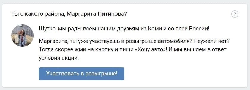 Помимо основного сюжета подписчики видели в сообществе ВКонтакте виджет с переходом на диалог с сообществом, где мы высылали ему условия участия в розыгрыше.