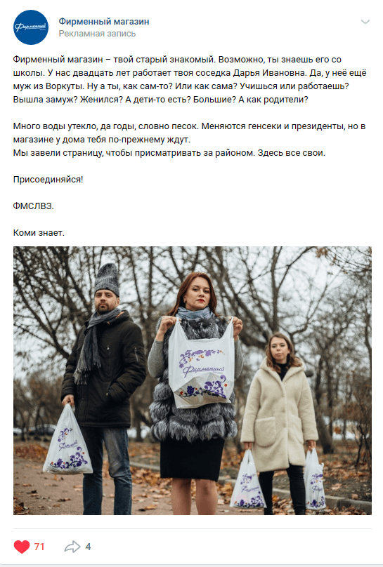 На старте кампании в таргетированную рекламу по республике Коми мы запустили вводный промопост, объясняющий «дворовую» концепцию и специфику паблика, где все соседи знают друг друга много лет.