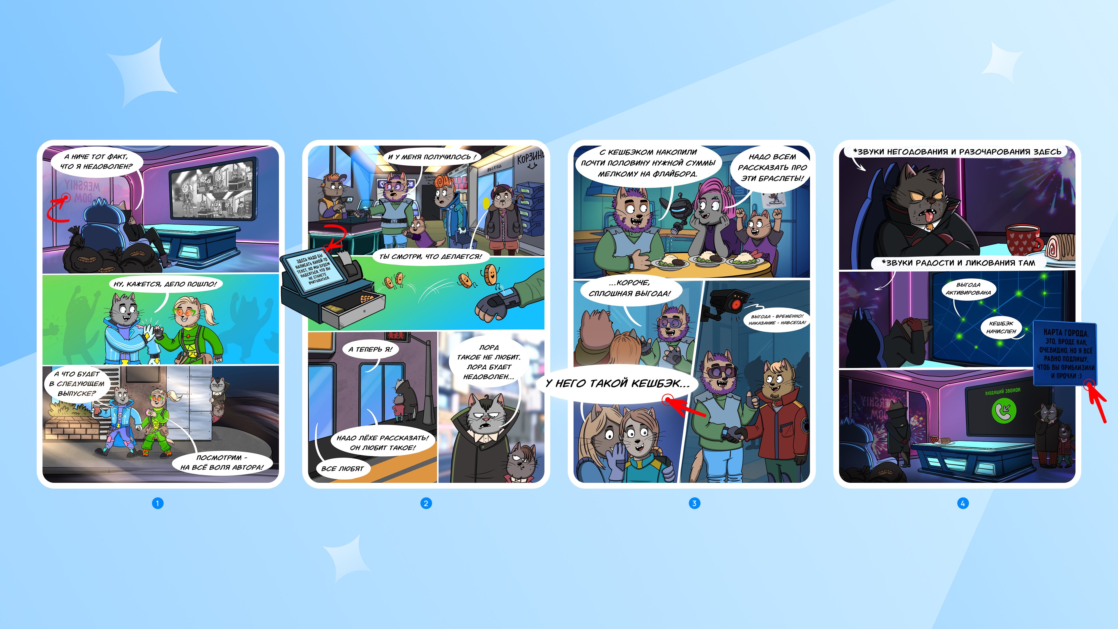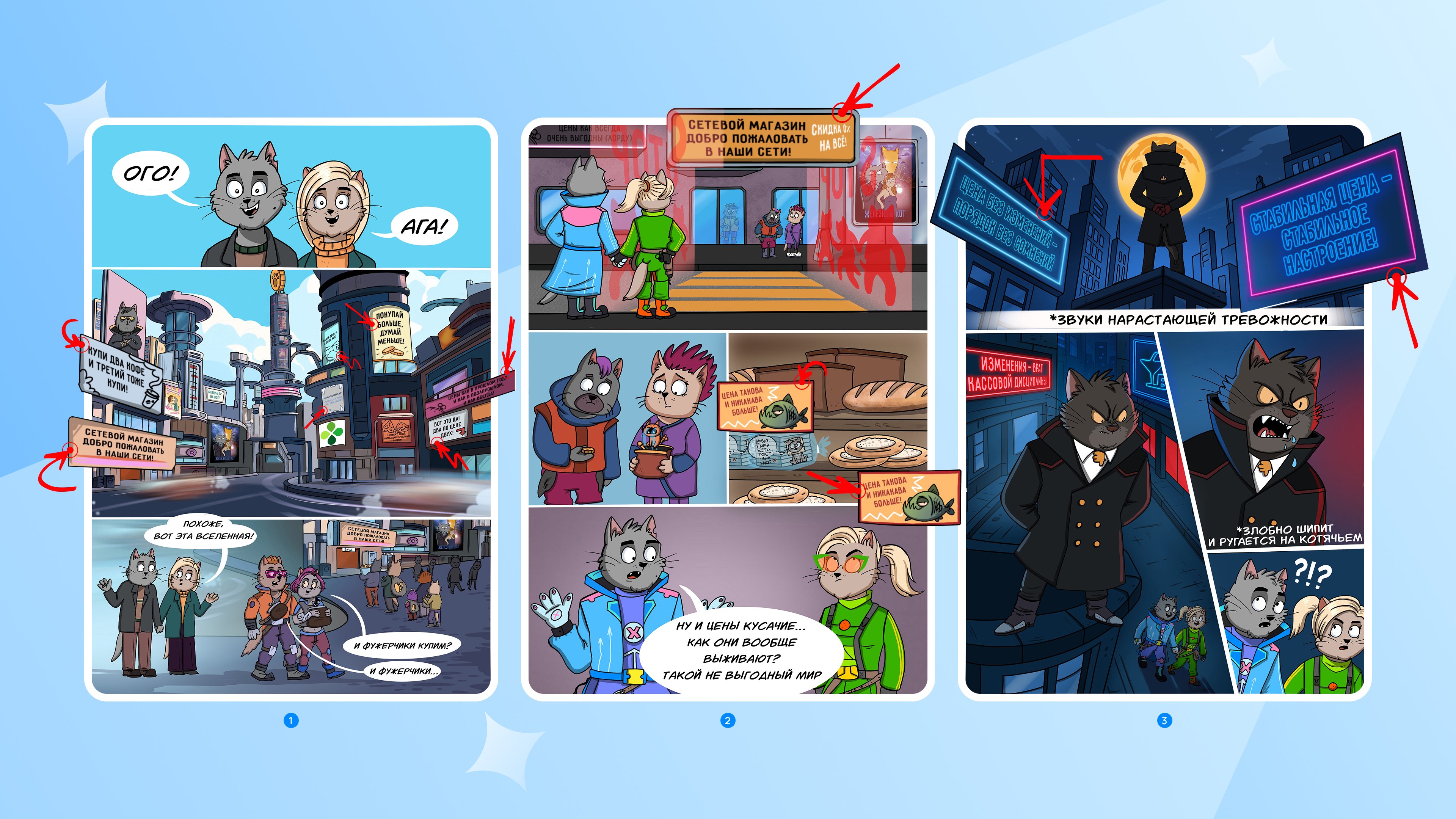 В сценарий комикса мы заложили отсылки и визуальные юмористические акценты — это отдельный слой, который усиливает вовлечение. В диалогах появлялись намеки на популярные мемы и интернет-контекст.