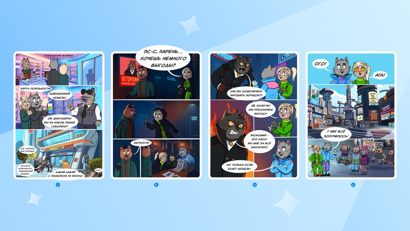 Совместно с автором мы придумали альтернативный мир, где нет скидок, кешбэка и программ лояльности. Вместе с героями пользователь попадает в эту реальность, видит, к чему приводит отсутствие выгоды, и постепенно понимает, как работает система.