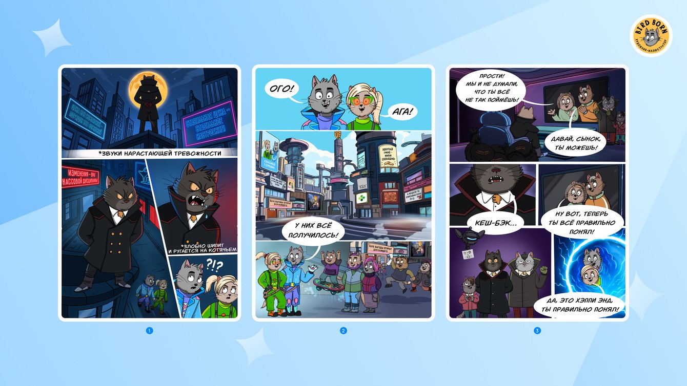 Мы выбрали формат комикс-сериала. Для работы над проектом пригласили художника Bird Born — ее стиль с запоминающимися персонажами идеально подошел для нашей задачи.