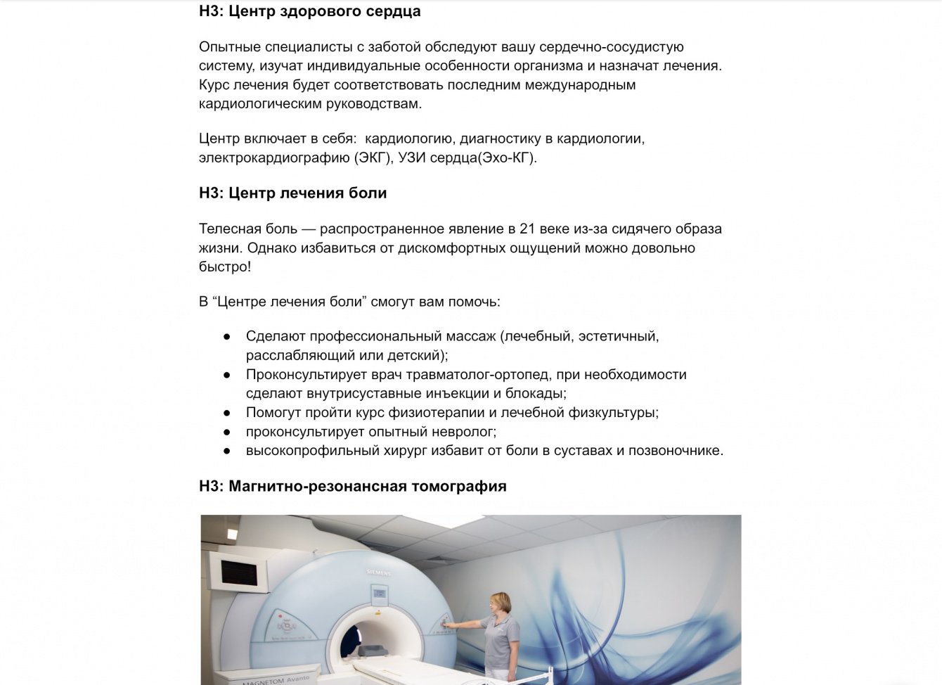 ✔️ Что делала: собрала информацию на сайте компании и у представителей больницы. Составила структуру. Написала по редполитике. Сделала SEO-оптимизацию с помощью ключевых слов и семантического ядра LSI. Прописала Title и Description.